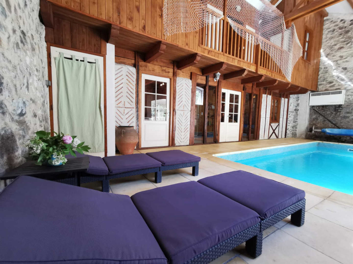 2 levels local stone house adjoining owner’s home, on village outskirts. Ground fl.: dining room/lounge area/kitchenette. 1st fl.: bedrm 1 (1 bed in 160), bedrm 2 (2 sgles), bedrm 3 (1 sgle), bathroom, wc. Included heating (on the ground & elect.), fireplace, w/m, t/d, d/w, TV, phone. Swimming pool inside (7X3,50 useful if outside temp. is over 4°), terrace (16 m²), furniture, parking. Bed linen provided. Surface area : 80 m². TOURIST ATTRACTIONS : Grottoes of Devèze, St Pons de Thomière (cathedral and museum), Héric Gorges.