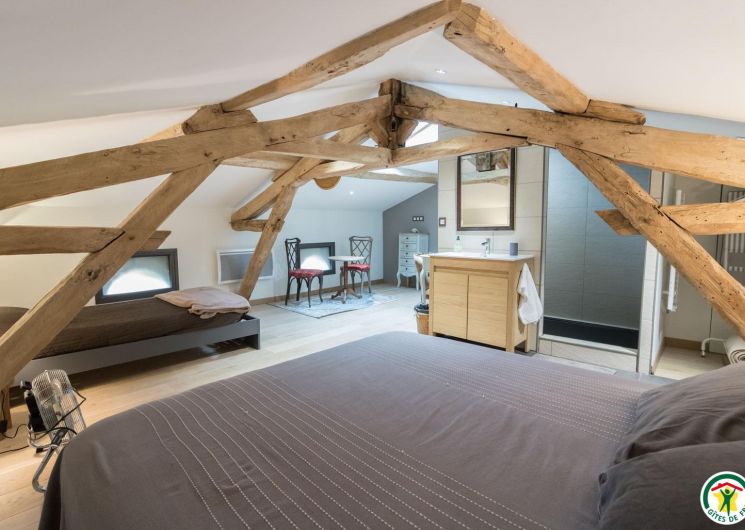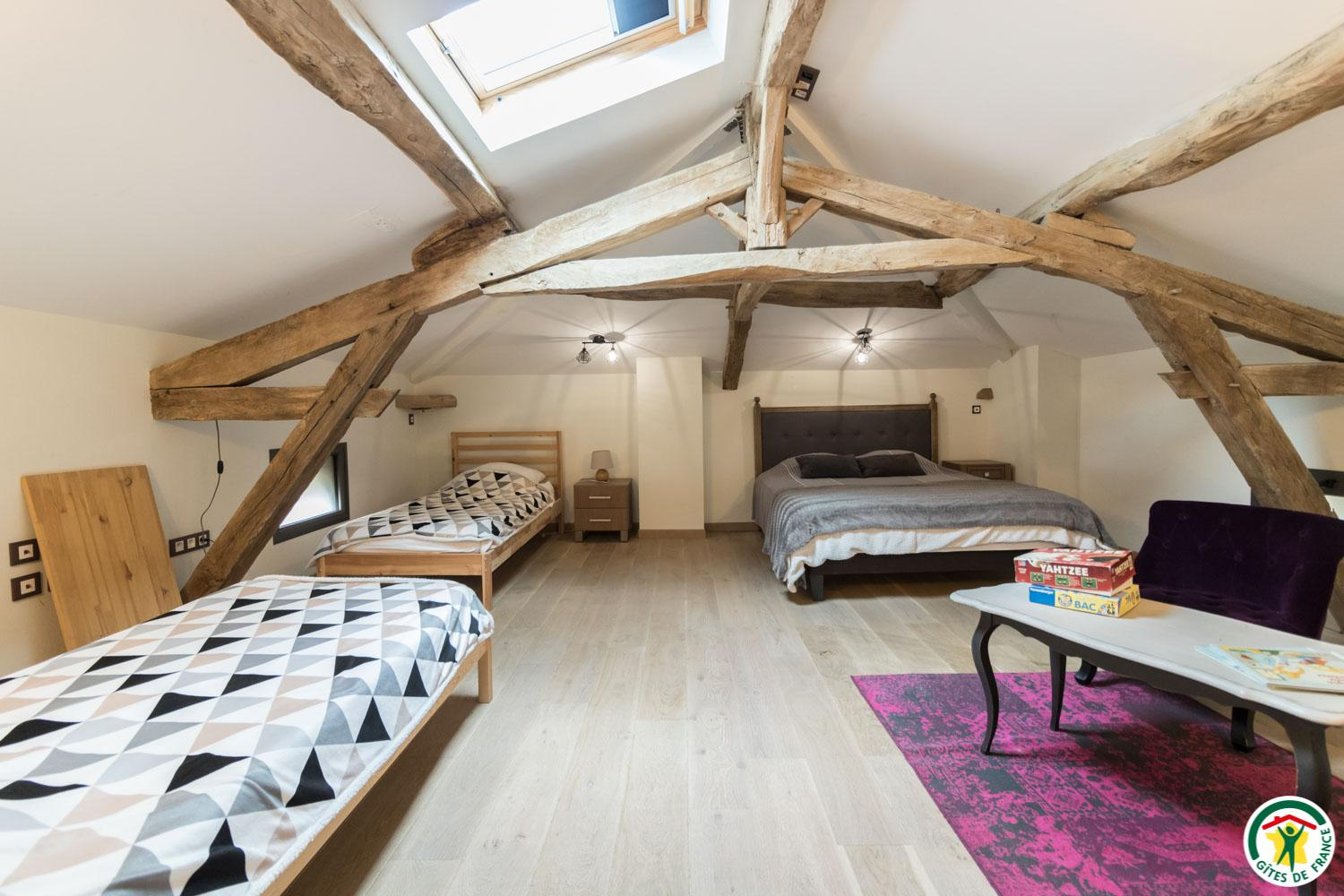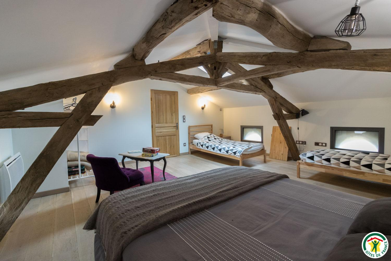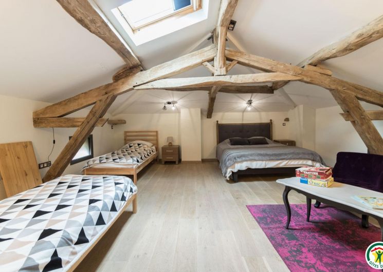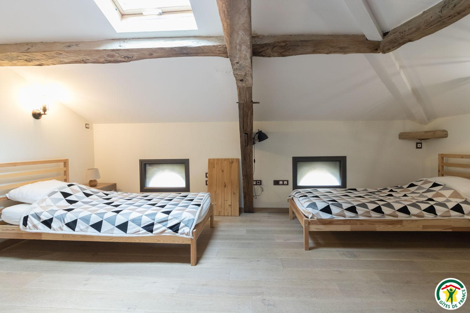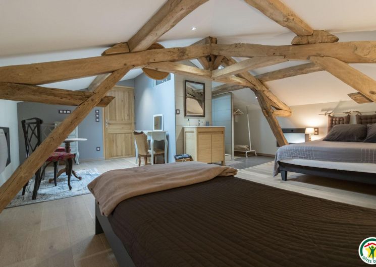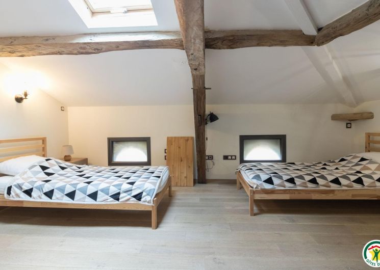 – On the second floor under the rafters (exposed trusses): 2 bedrooms (1 double bed 160*200cm + 2 single beds 90*200cm) (1 double bed 160*200cm + 1 single bed 90*200cm + open shower room), separate WC.