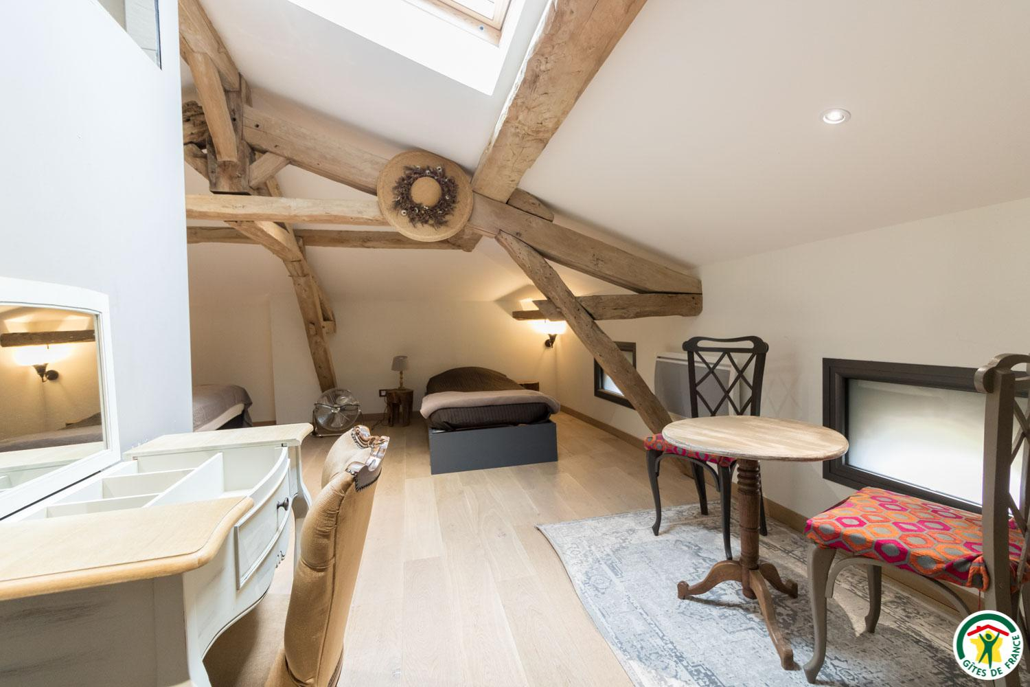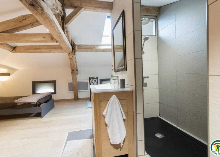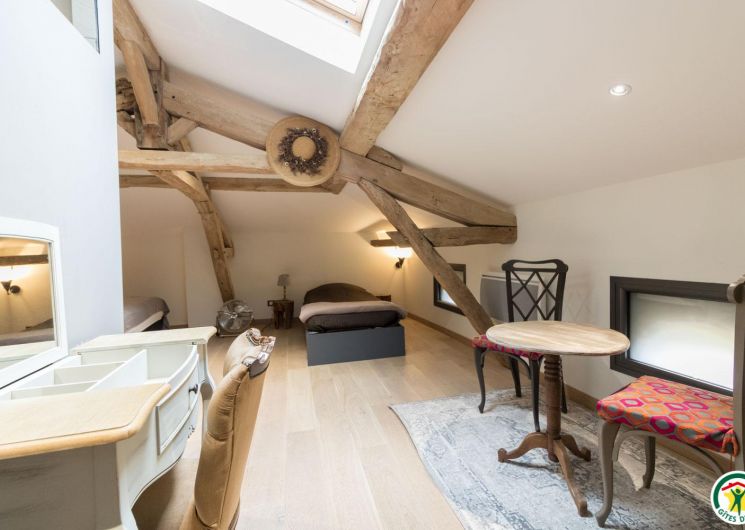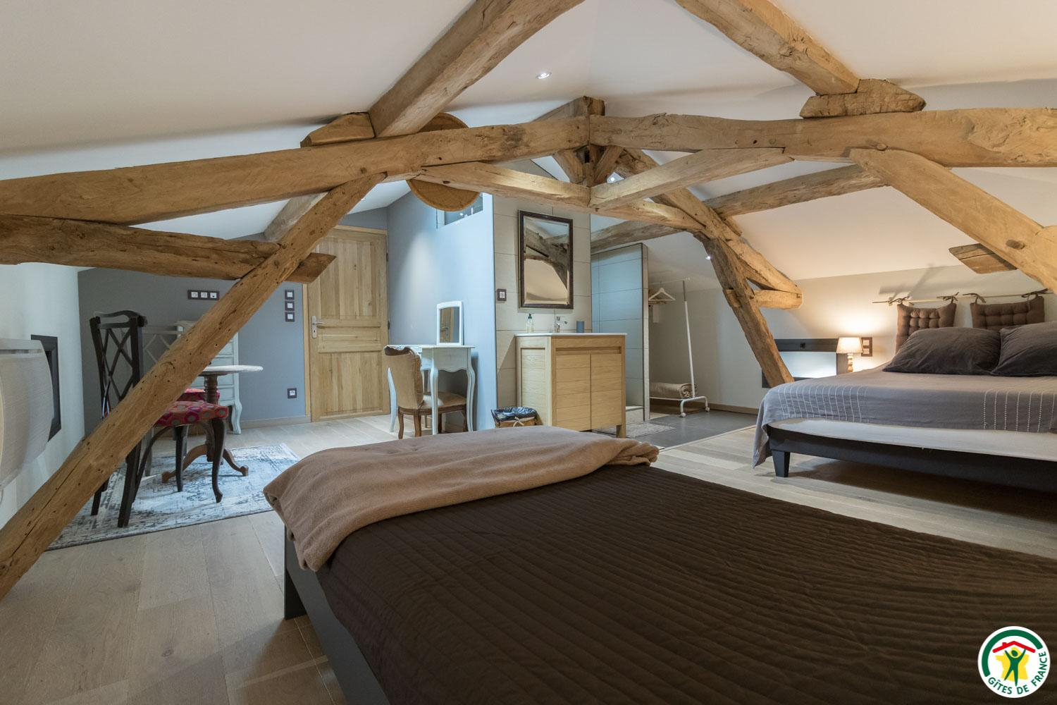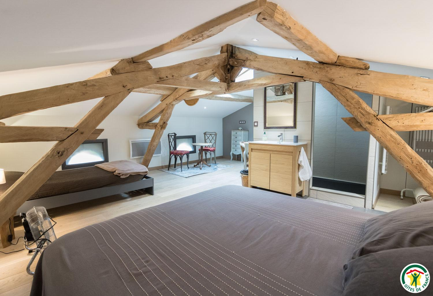 – On the second floor under the rafters (exposed trusses): 2 bedrooms (1 double bed 160*200cm + 2 single beds 90*200cm) (1 double bed 160*200cm + 1 single bed 90*200cm + open shower room), separate WC.