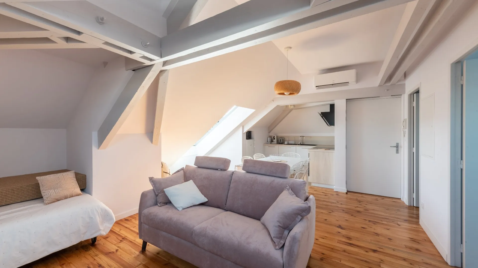 Le grenier de notre enfance : univers chaleureux, de jolies poutres, des matières nobles, dans un univers spacieux, moderne et lumineux, une température idéale quelle que soit la saison (climatisation) et une ouverture sur l’extérieur (velux).
