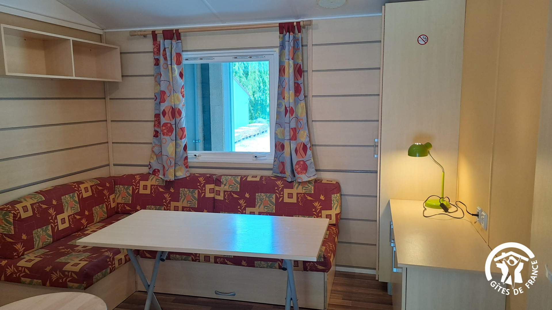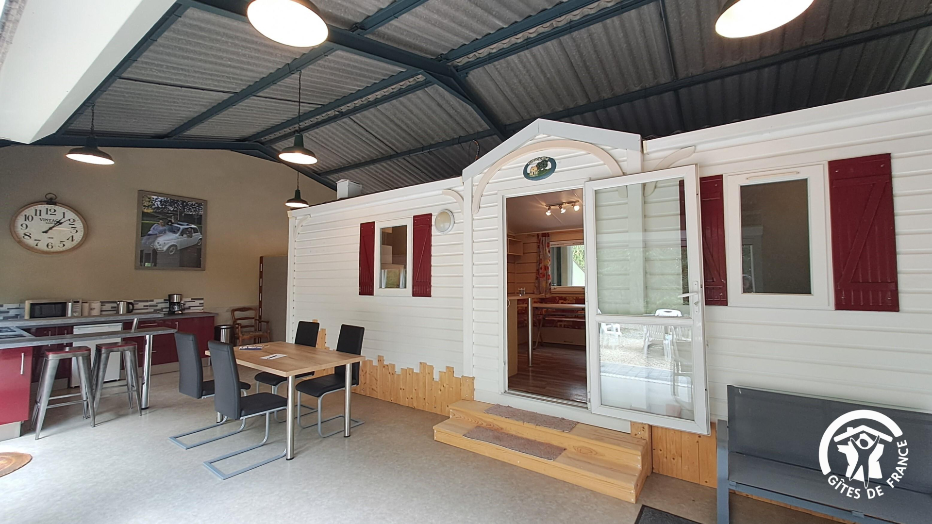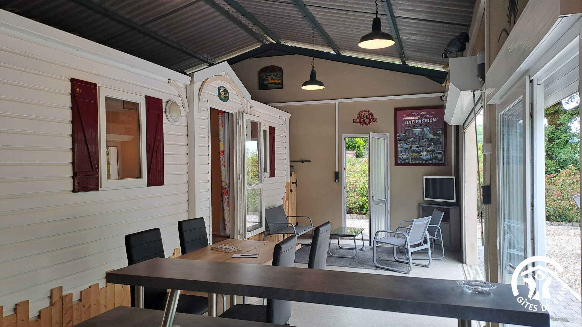 Salle à manger devant le mobilhome, à côté de la cuisine. Coin salon avec TV et jeux de sociétés.