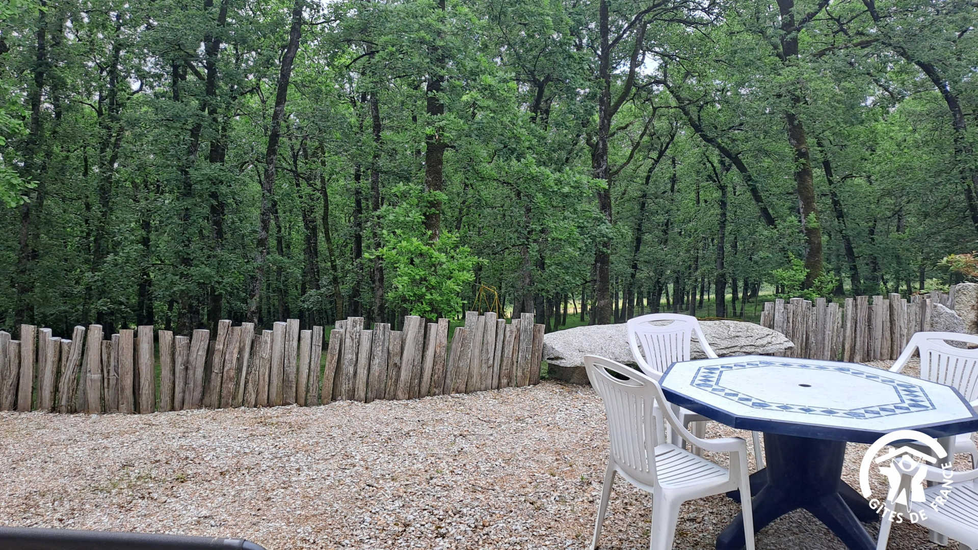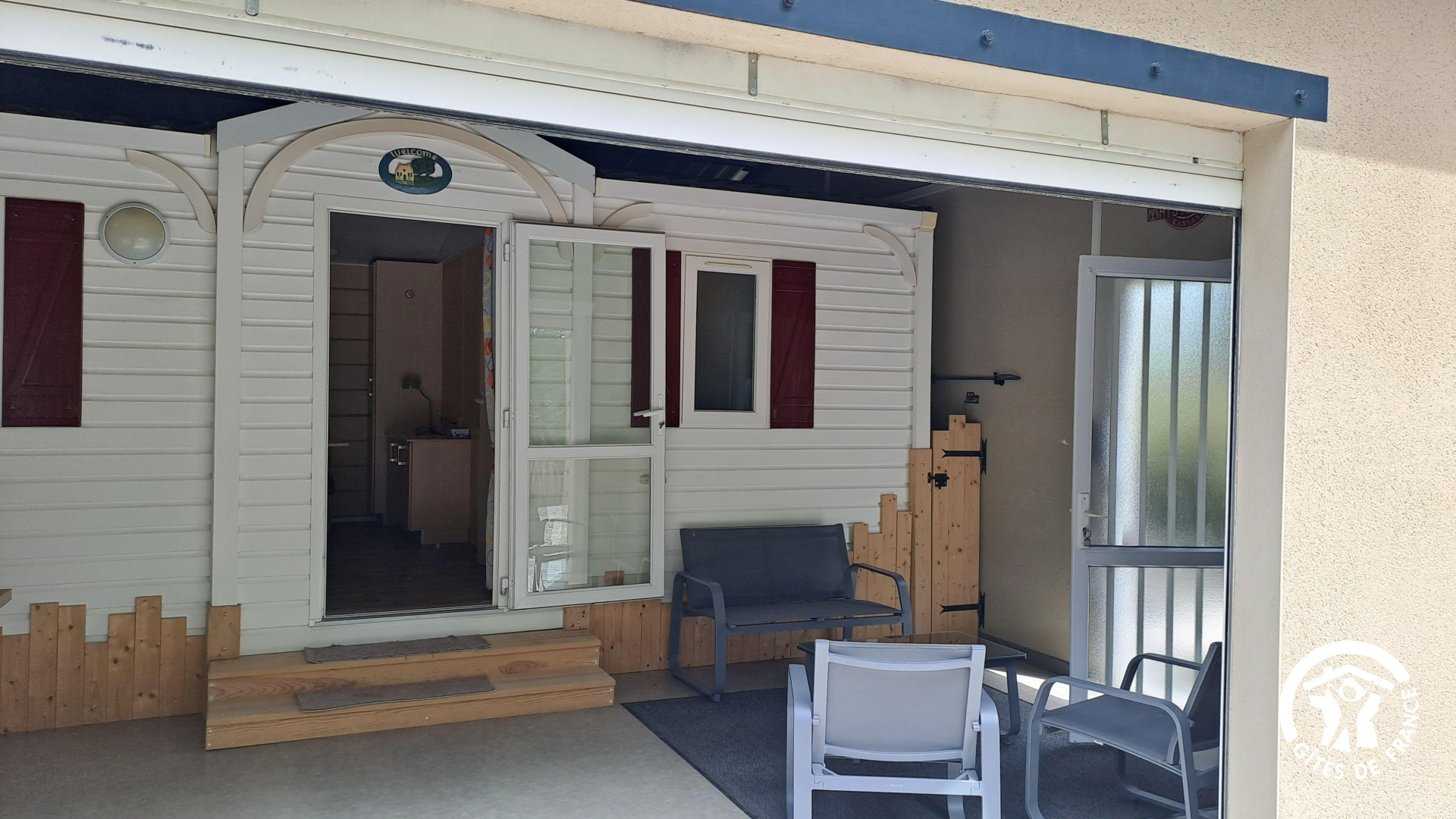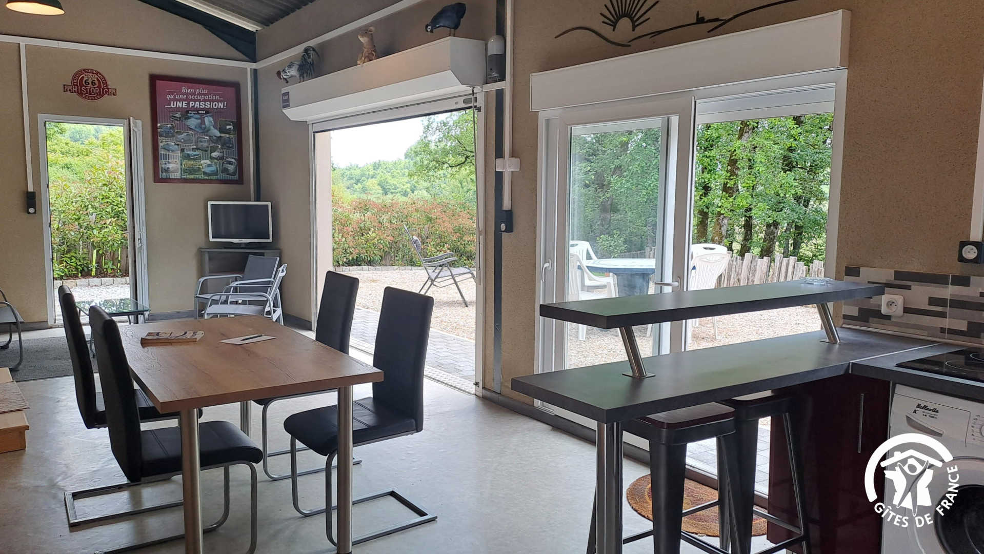 Salle à manger devant le mobilhome, à côté de la cuisine. Coin salon avec TV et jeux de sociétés.