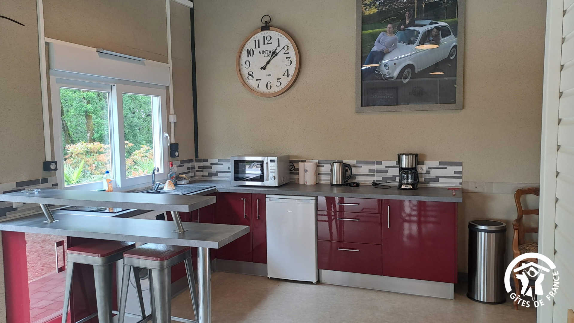 Une fois dans le hangar, vous profitez d’une seconde cuisine, plus grande, offrant plus d’équipements : plaque à induction, micro-ondes, cafetière à filtre, bouilloire, grille-pain, frigo top et machine à laver le linge. Sur le côté de la cuisine : grand congélateur ou mini-four électrique.