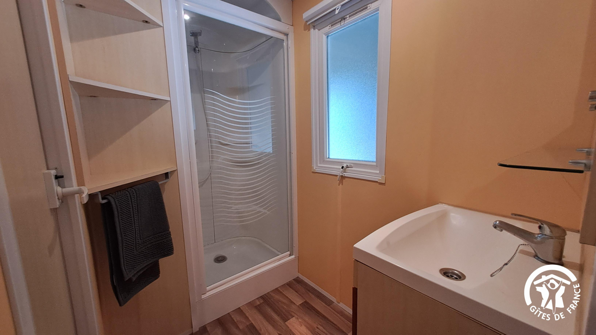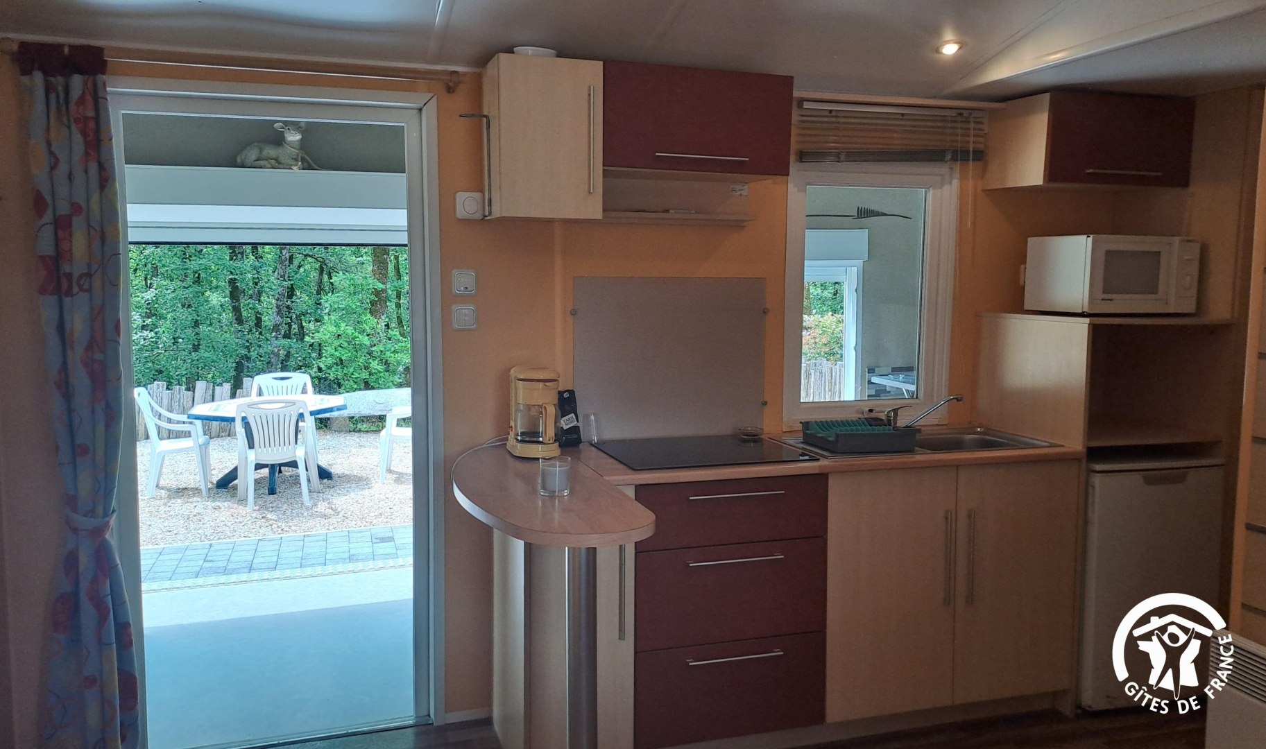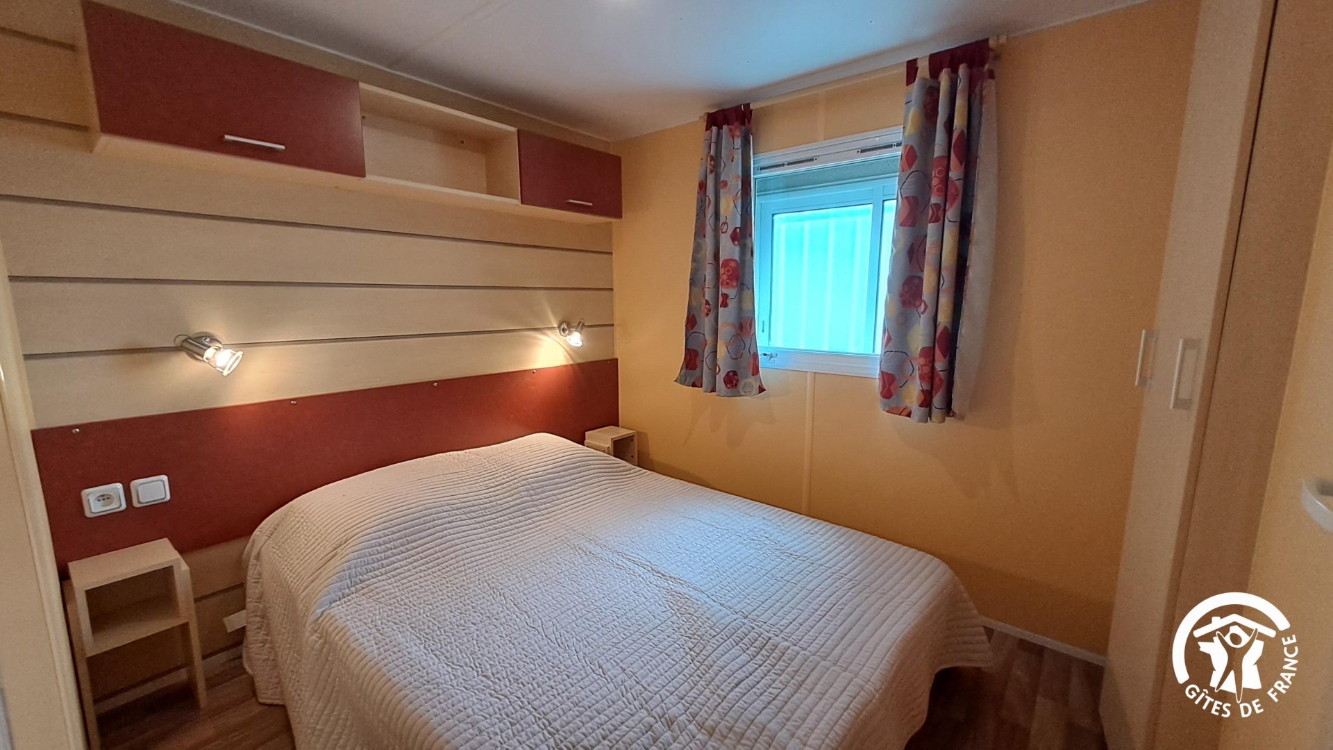 Le mobilhome est traditionnellement équipé d’une cuisine ouverte sur un espace salon. Une première chambre avec un lit double en 140x190cm avec un accès à la salle d’eau avec douche et évier. Wc indépendant. Une seconde chambre, plus petite, avec deux lits simples en 80x190cm. Mobilhome équipé d’une climatisation réversible.