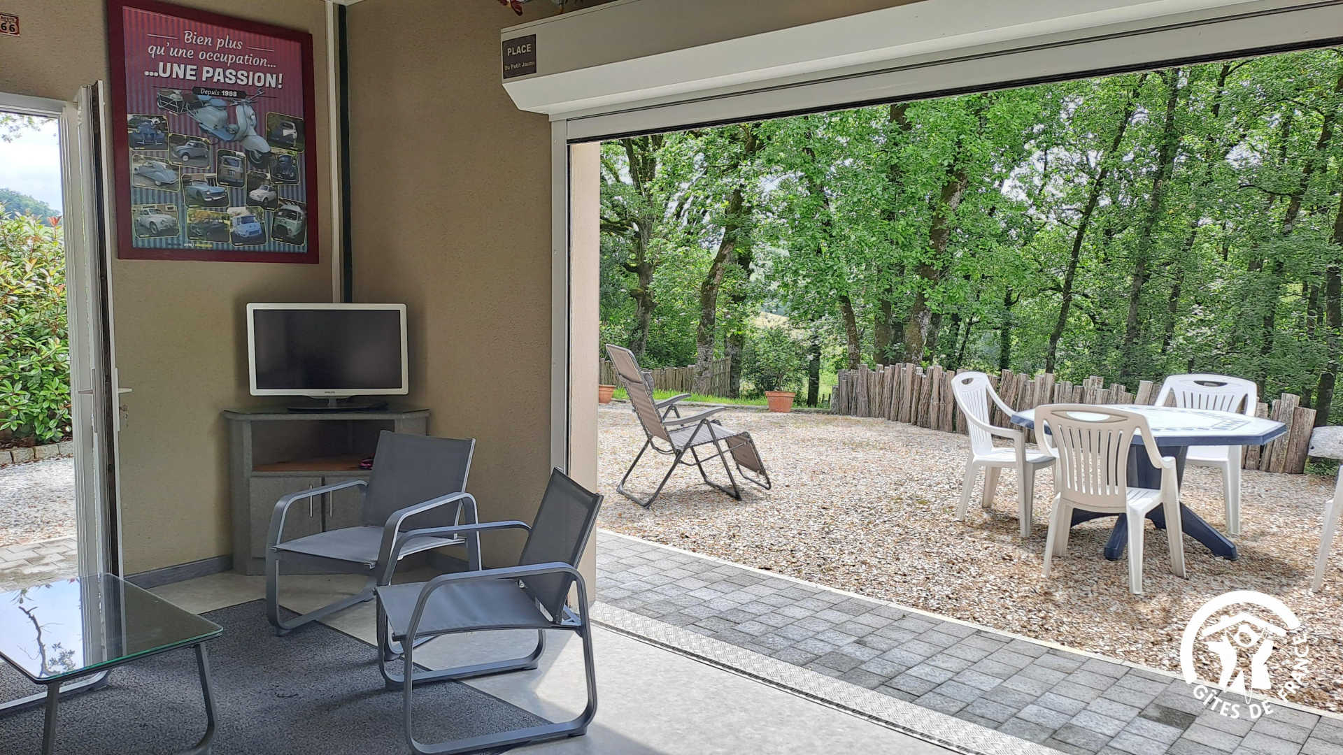 Extérieurs : grand jardin avec bois privé d’environ 4000m². Vous pouvez vous garer facilement de l’autre côté du hangar, où les graviers seront ravir les amateurs de pétanque.