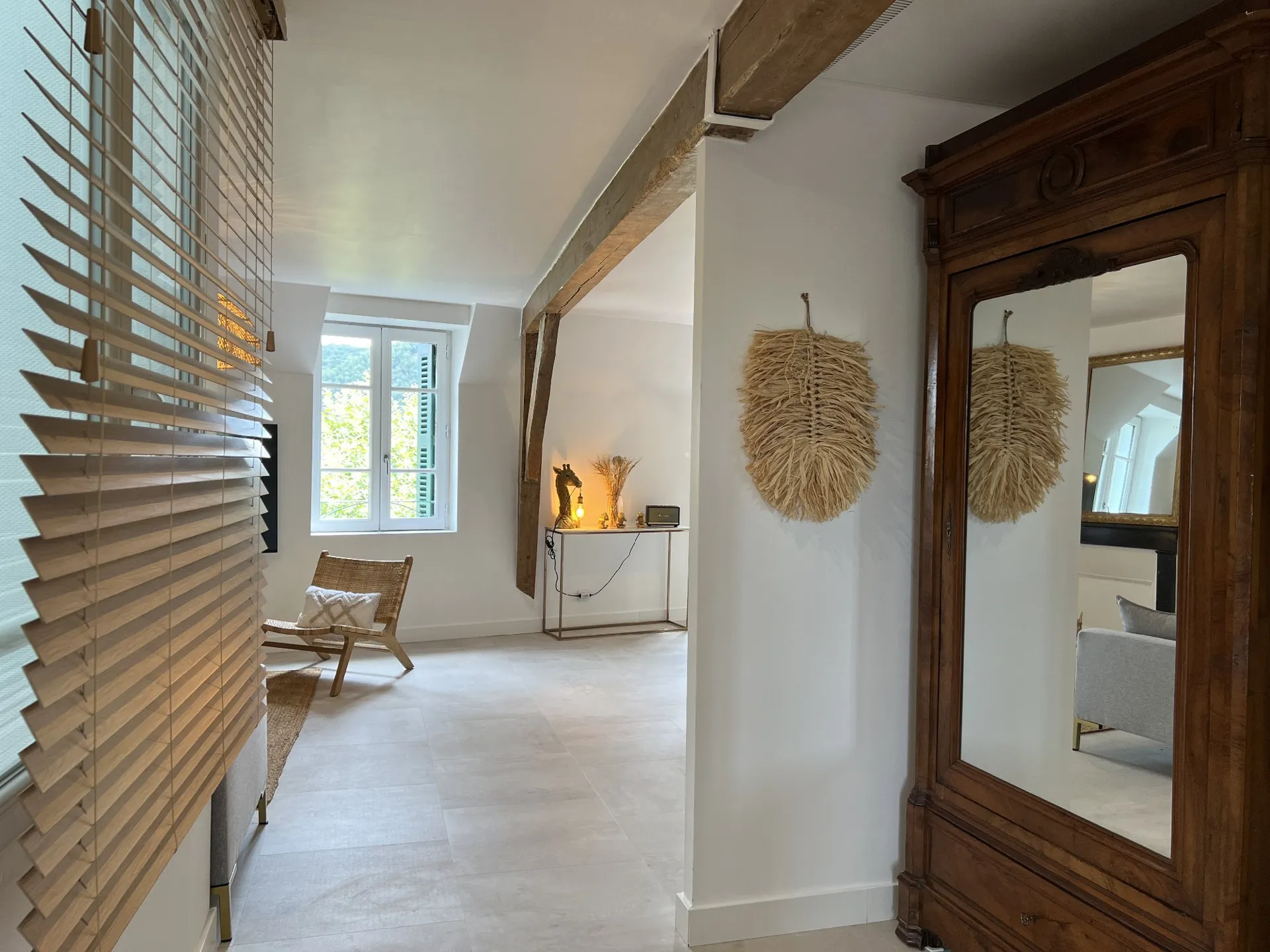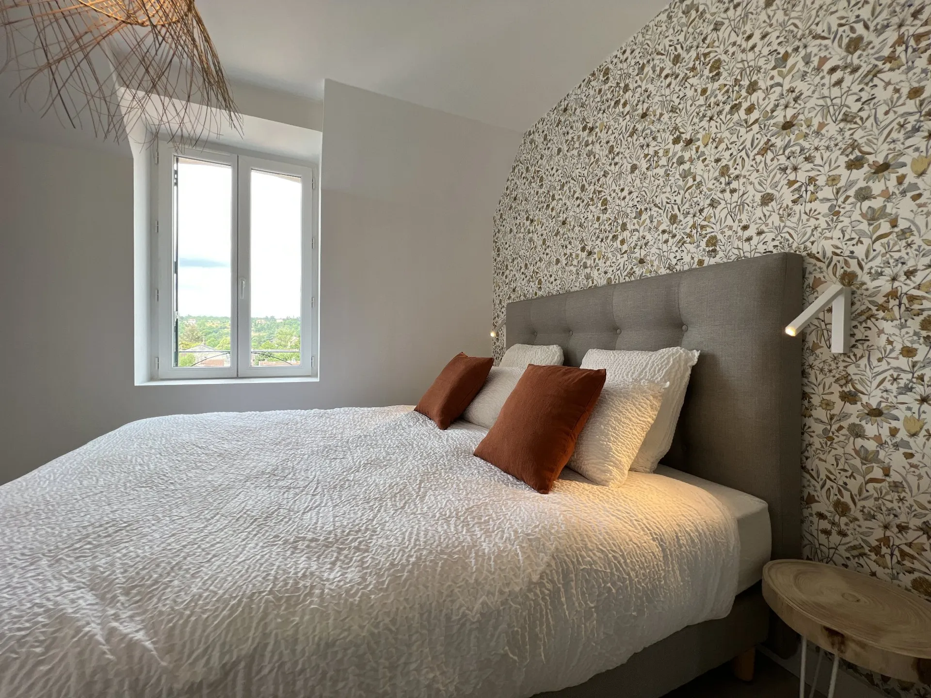 Loft de 80 m², climatisé, situé en bord de la rivière Aveyron décoration Bohème chic, connecté, avec parking au pied de l’immeuble. Deux chambres.