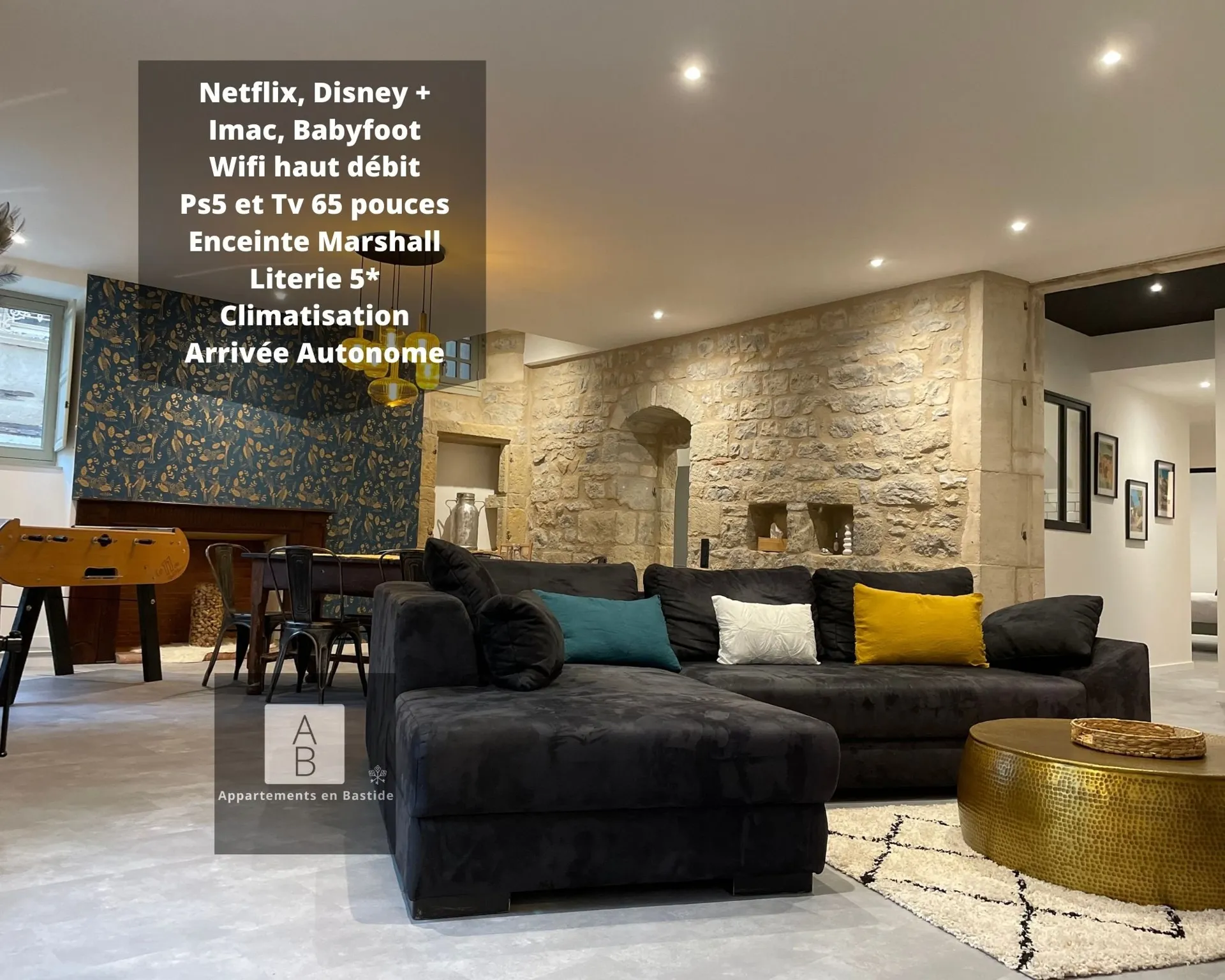 Vous disposerez d’un grand séjour équipé (enceinte Marshall, TV de 170 cm, PS5, baby-foot).