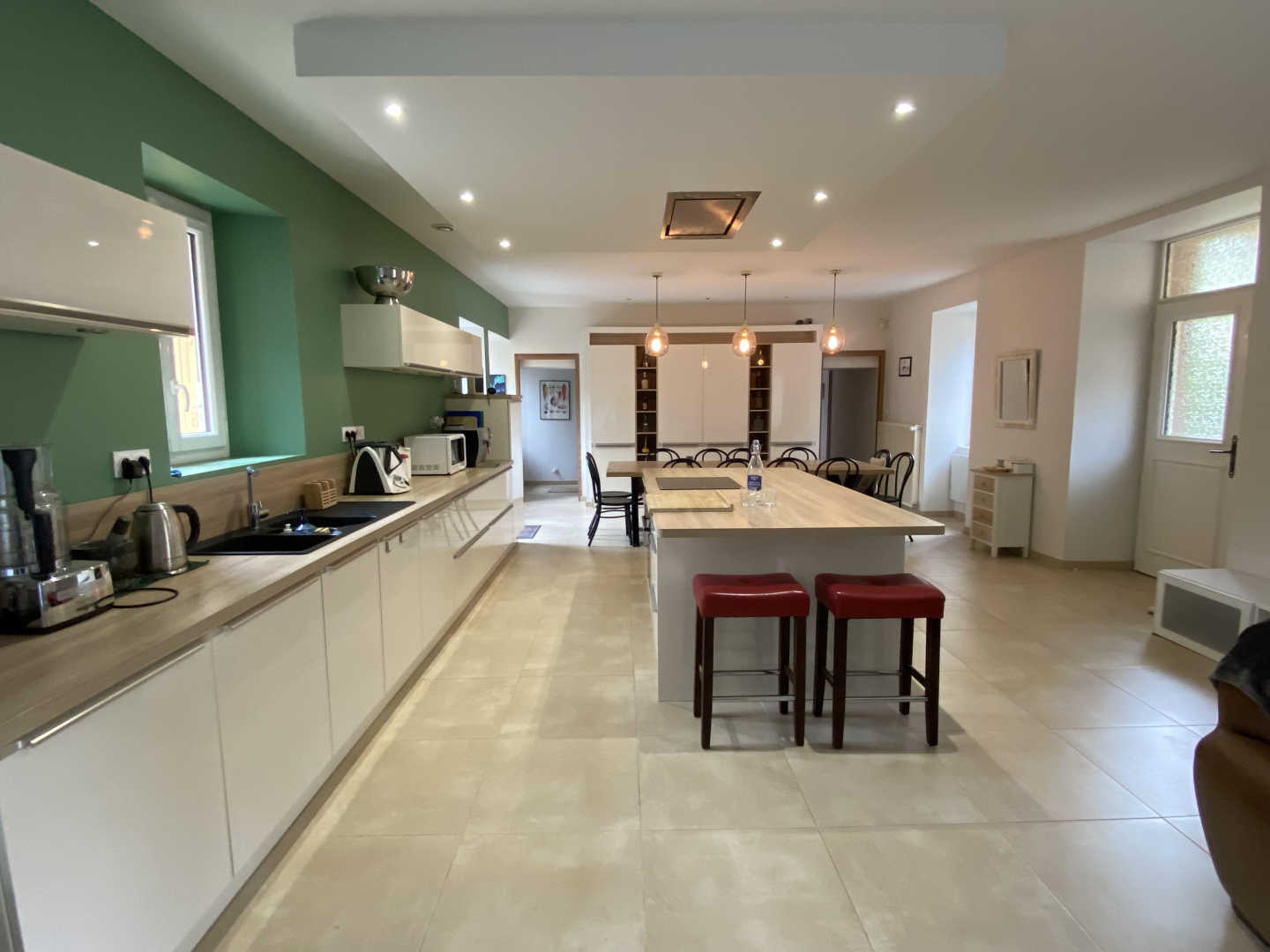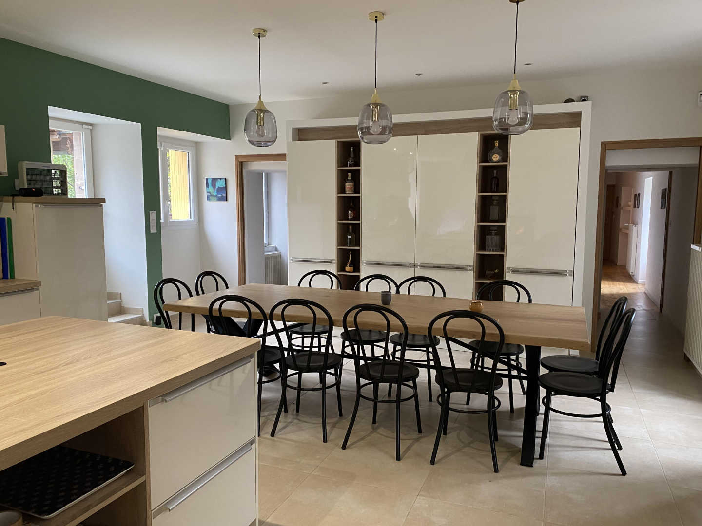 Living room: kitchen opening onto the dining table and a spare lounge facing the working fireplace. Fully equipped kitchen: food processor, Thermomix®, microwave, kettle, bean-to-cup coffee maker, toaster, oven, dishwasher, and more.