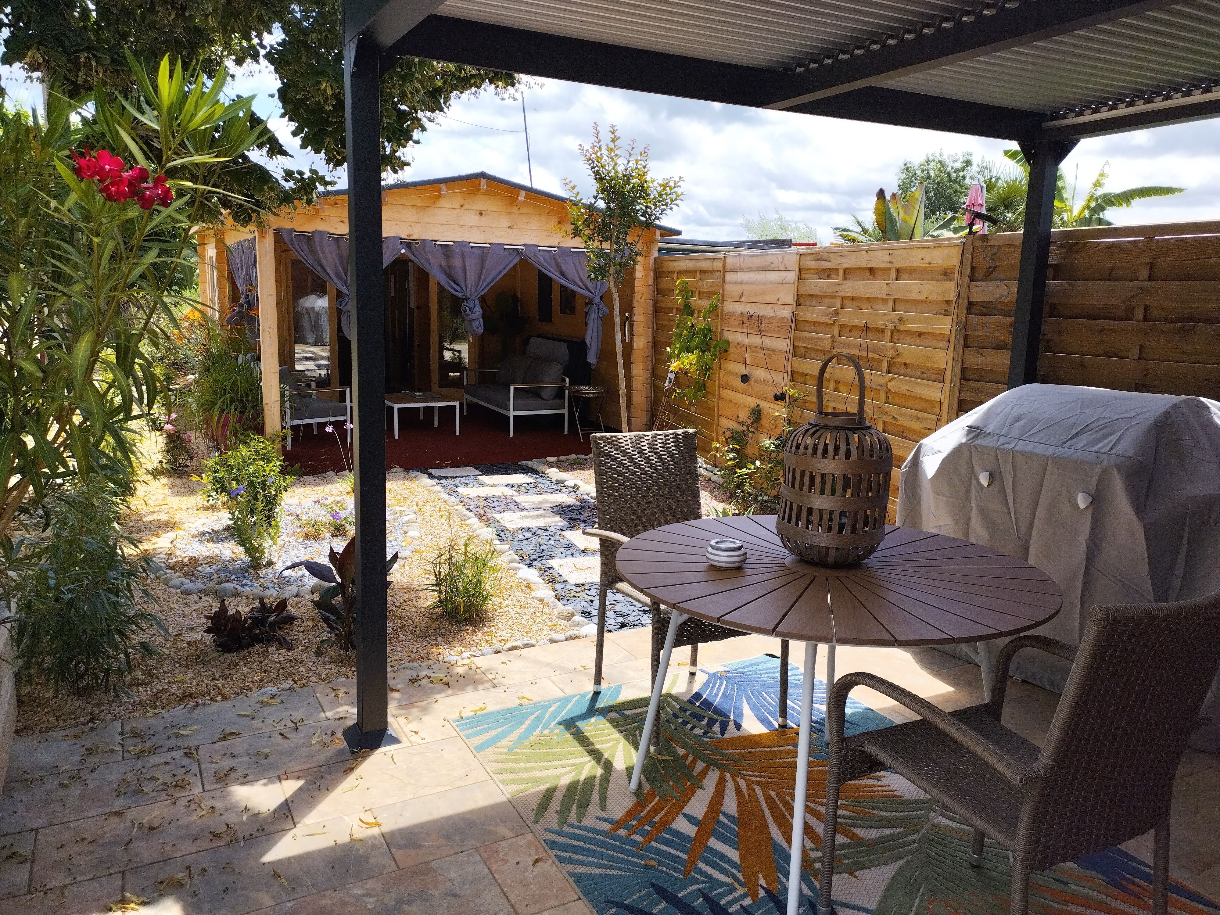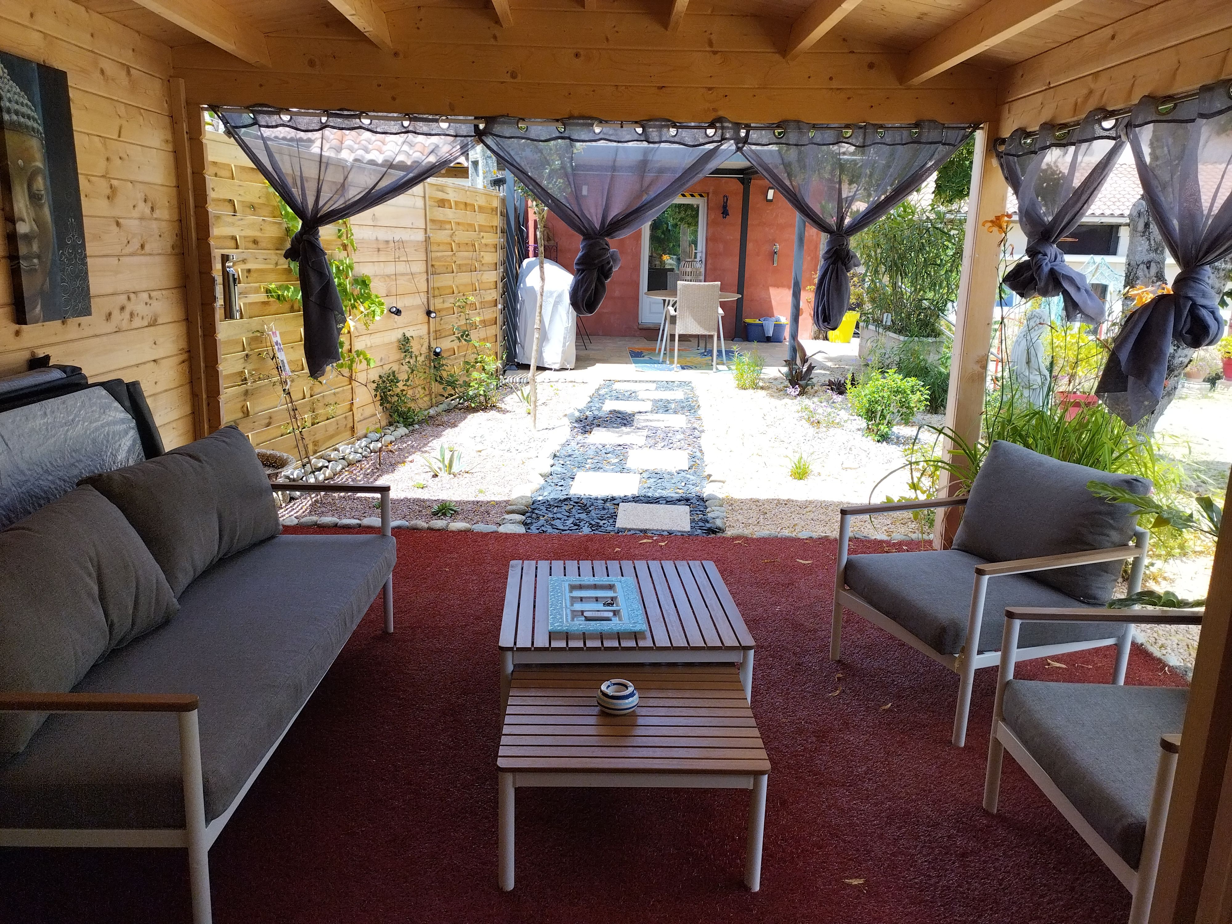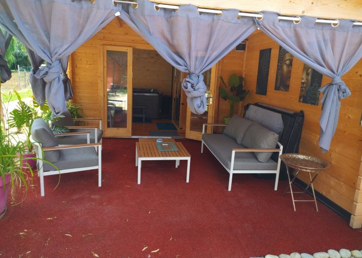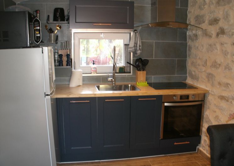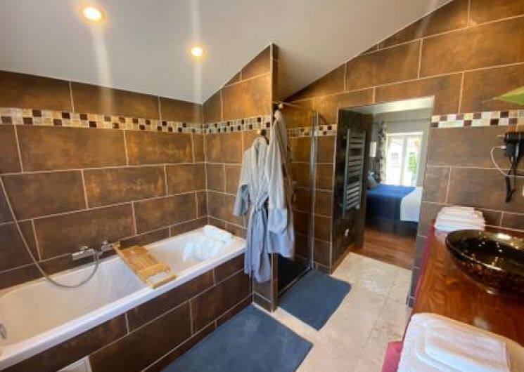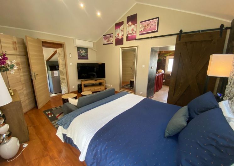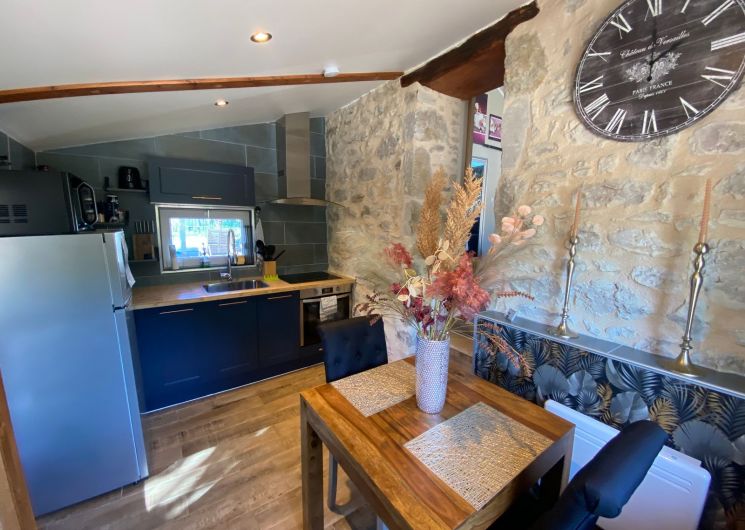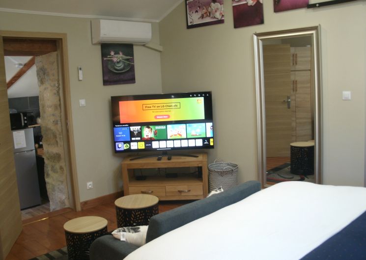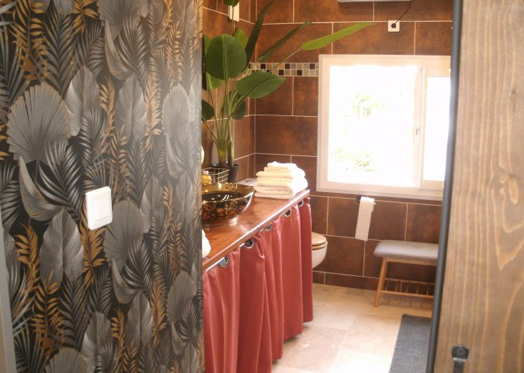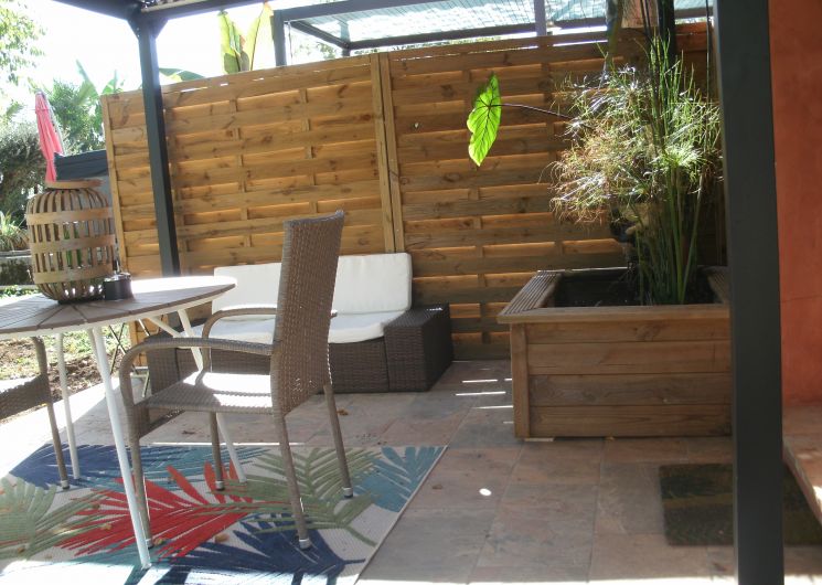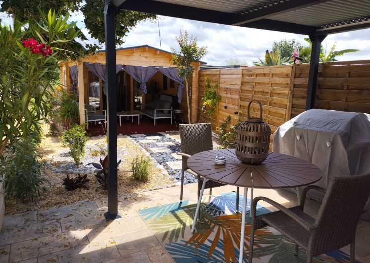 After a few steps from the car park, access to the terrace, garden furniture and pergola. One step leads up to the living area (fitted kitchen: fridge, freezer, hob, oven, microwave) with table and chairs. After 4 steps, the bedroom with 1 x 160 x 200 bed, sofa and TV. Bathroom with shower and bath, washing machine and tumble dryer. Bed linen and towels provided, included in the price. Free Wi-Fi in the accommodation. Essential oils for the Hammam. Bathrobes provided. From 1 May to 31 October, access to the shared swimming pool and spa.