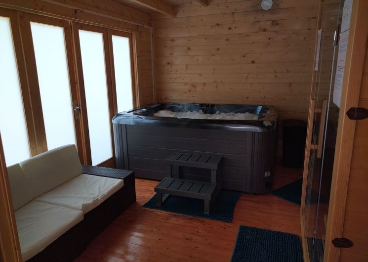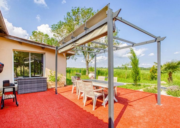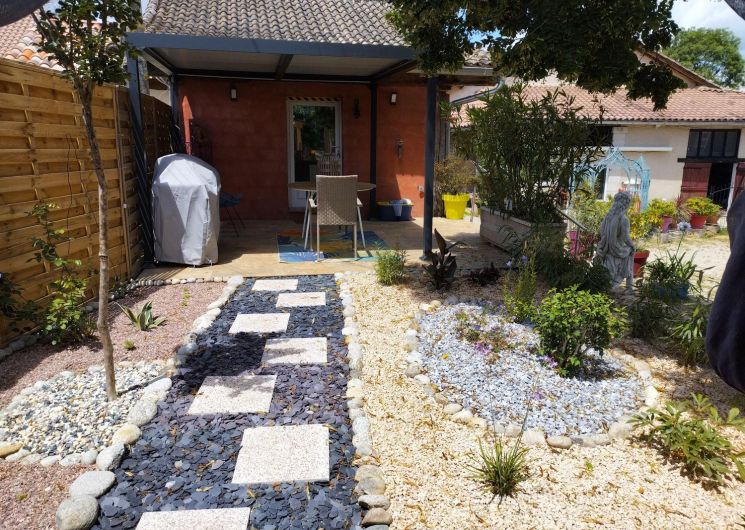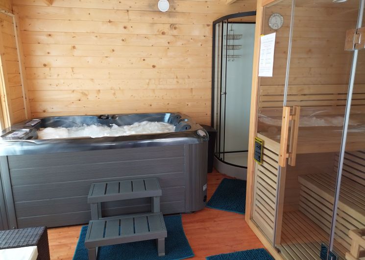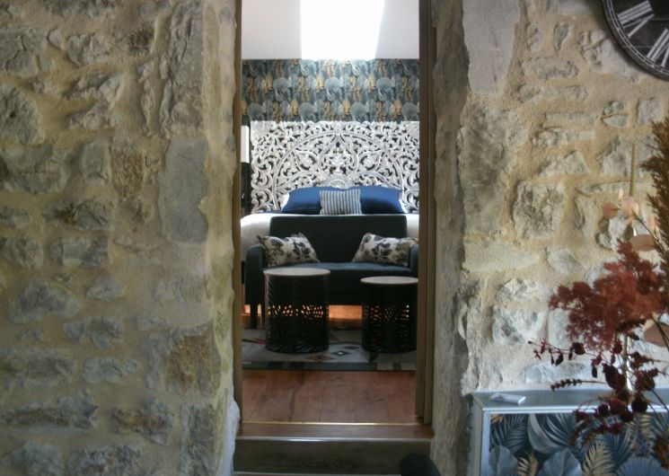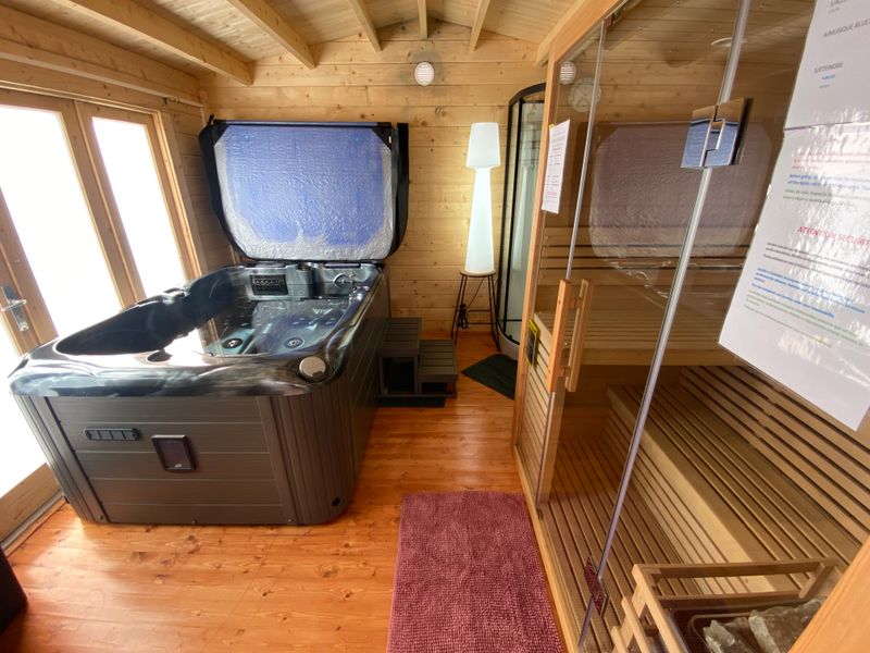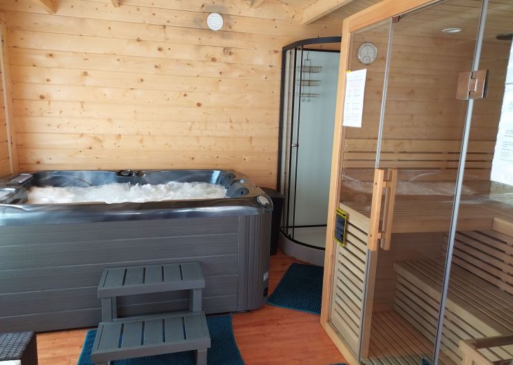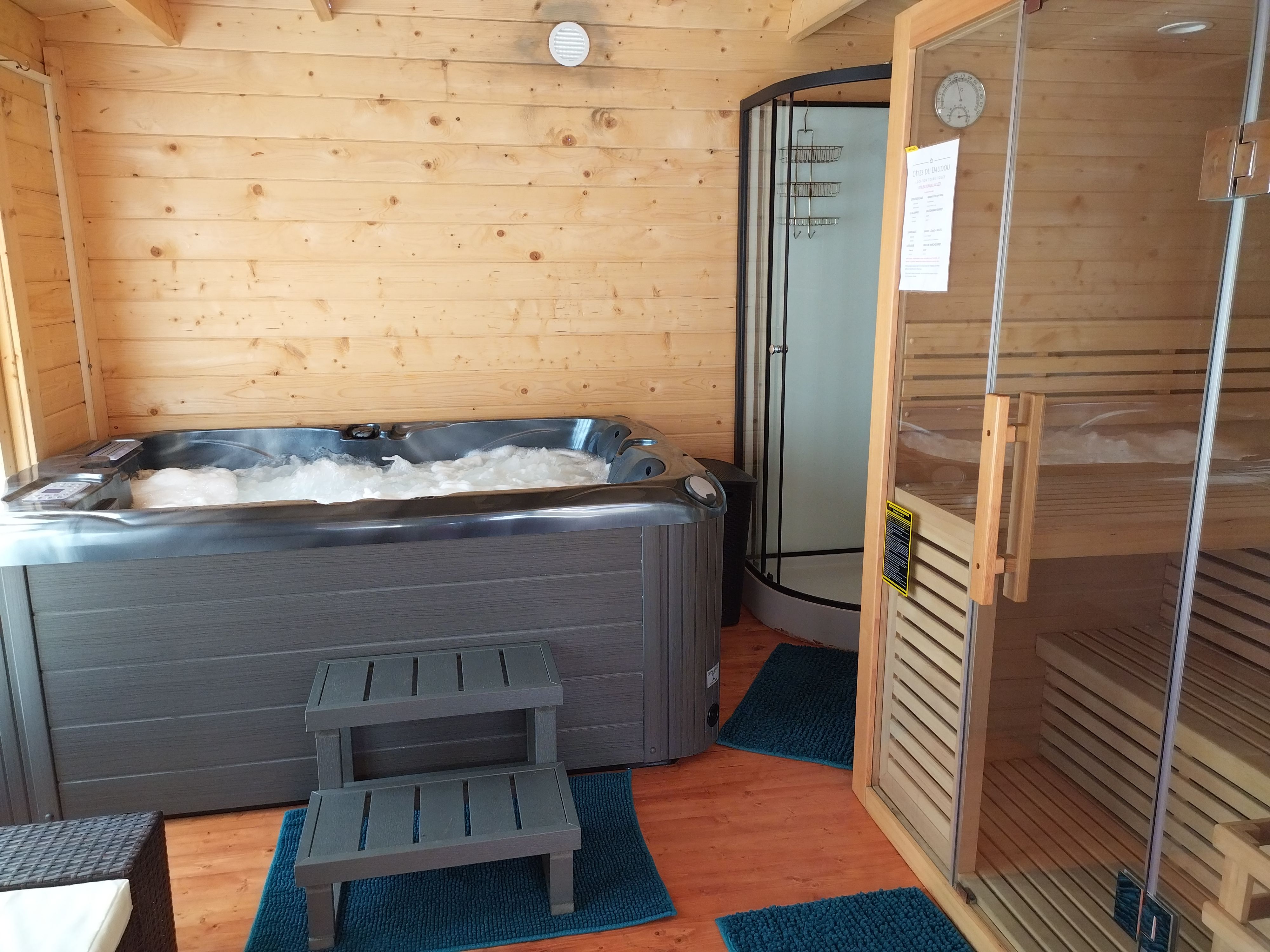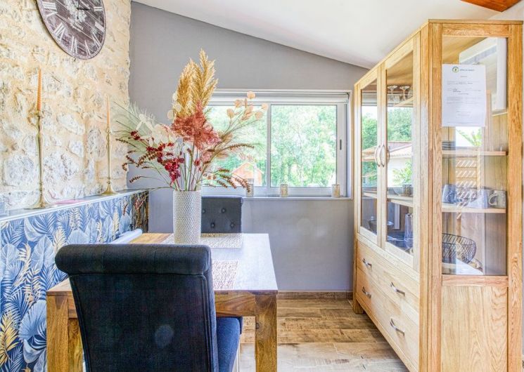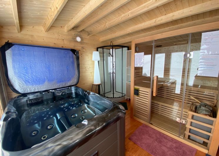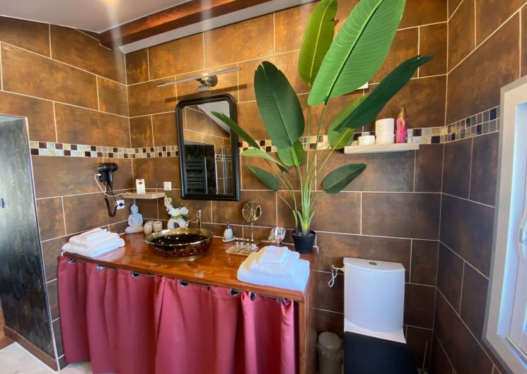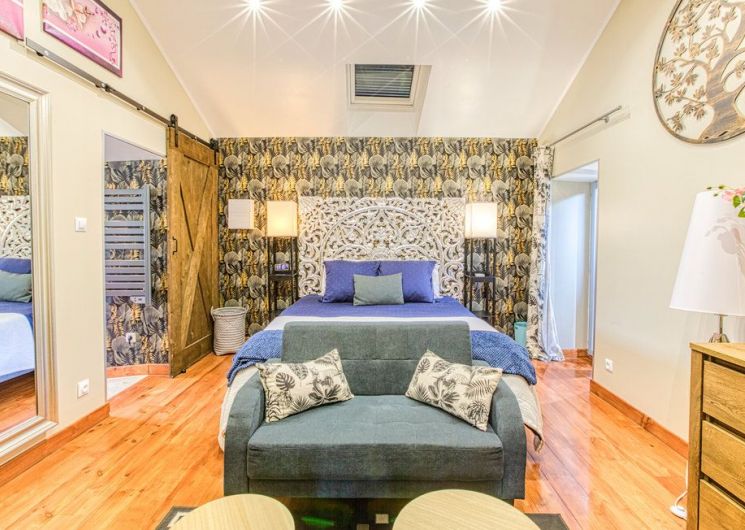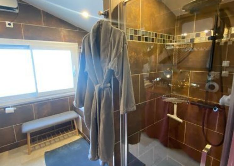 After a few steps from the car park, access to the terrace, garden furniture and pergola. One step leads up to the living area (fitted kitchen: fridge, freezer, hob, oven, microwave) with table and chairs. After 4 steps, the bedroom with 1 x 160 x 200 bed, sofa and TV. Bathroom with shower and bath, washing machine and tumble dryer. Bed linen and towels provided, included in the price. Free Wi-Fi in the accommodation. Essential oils for the Hammam. Bathrobes provided. From 1 May to 31 October, access to the shared swimming pool and spa.