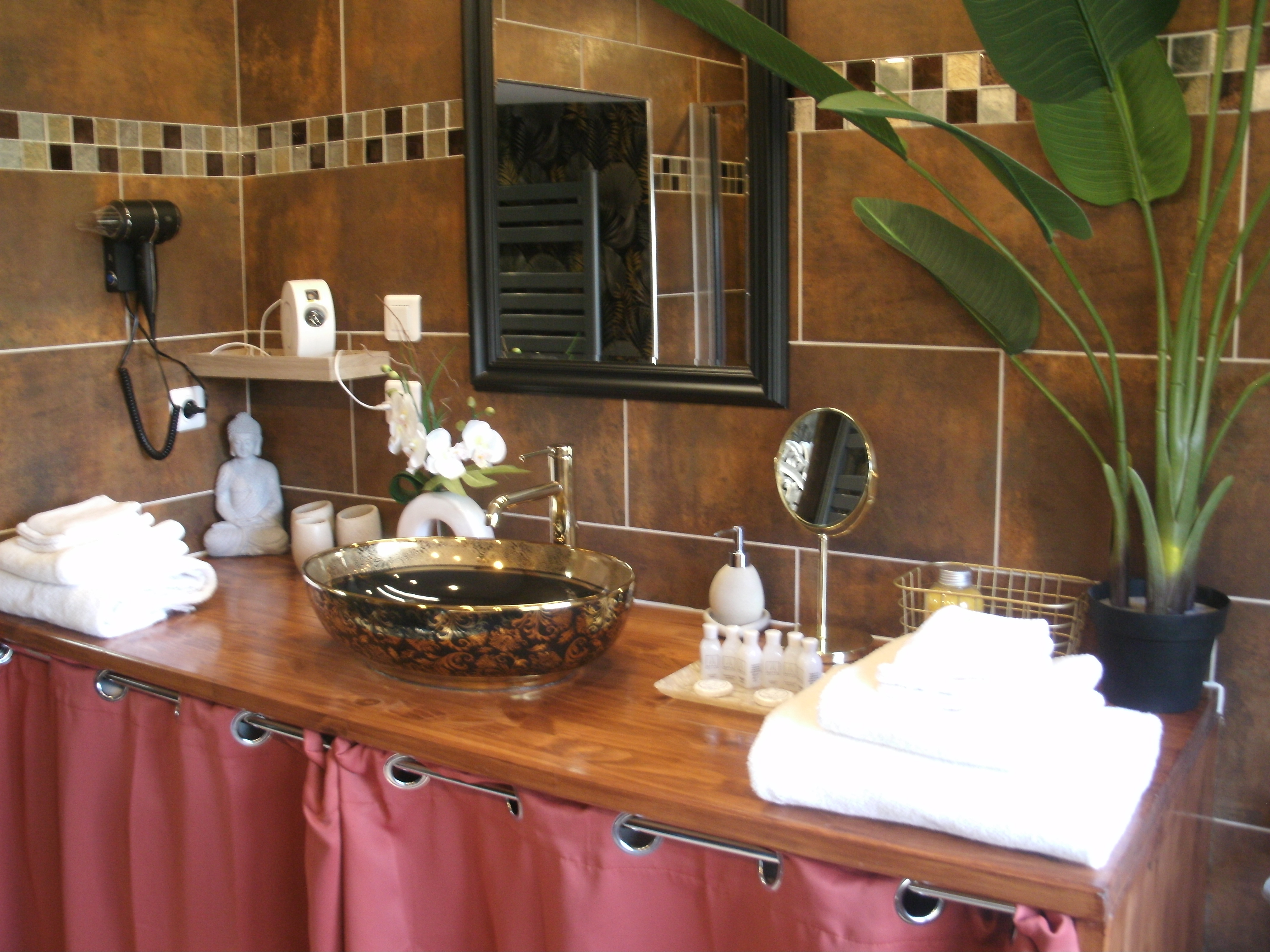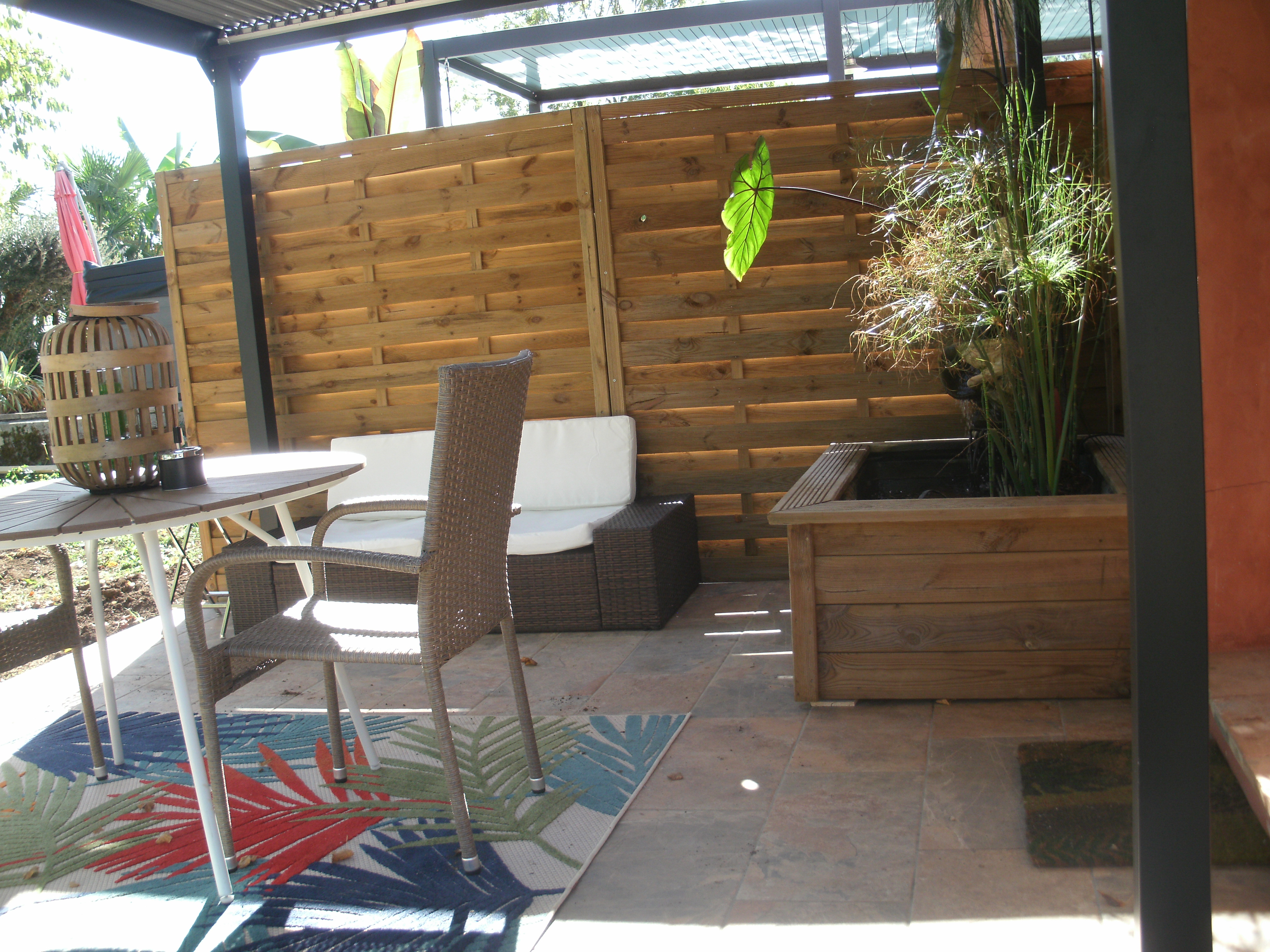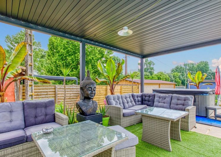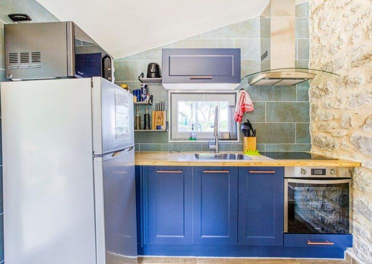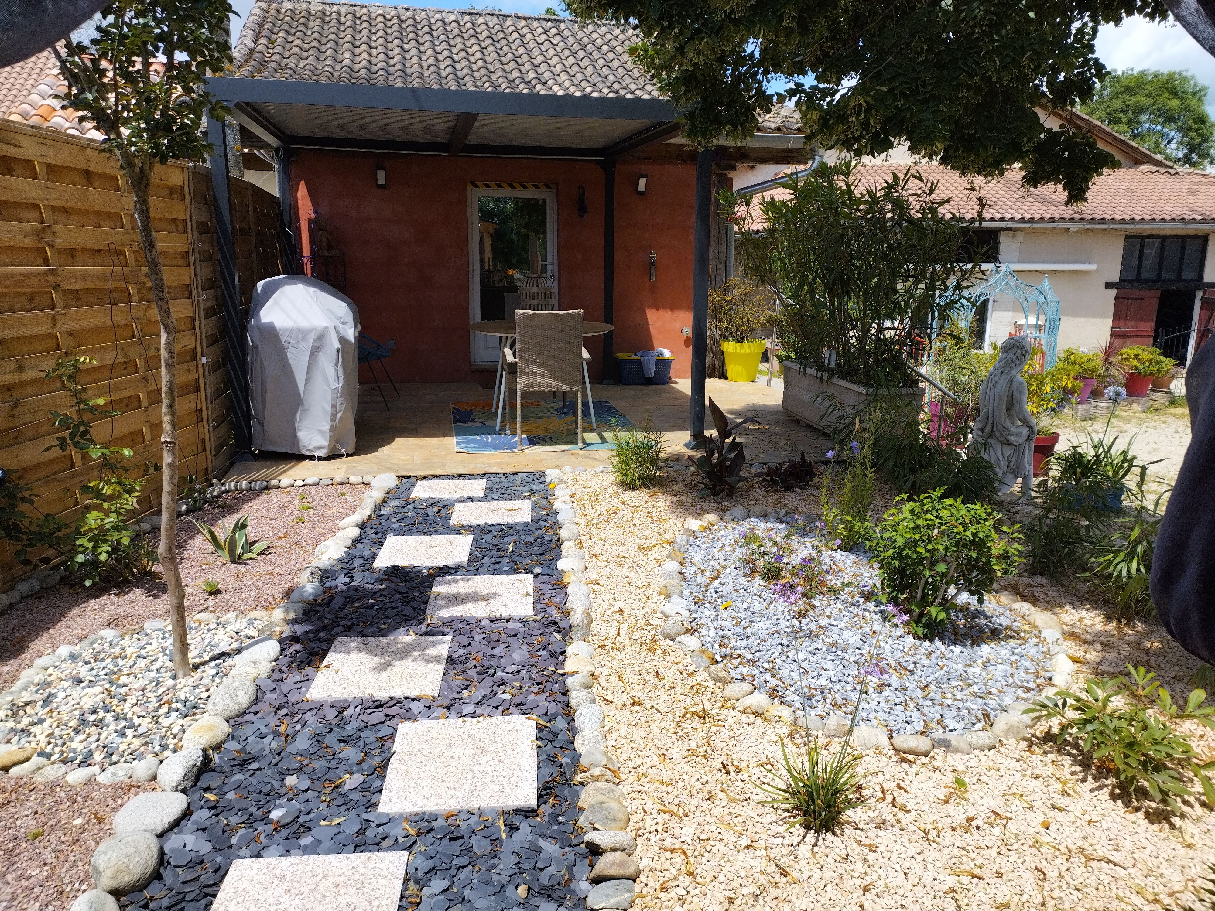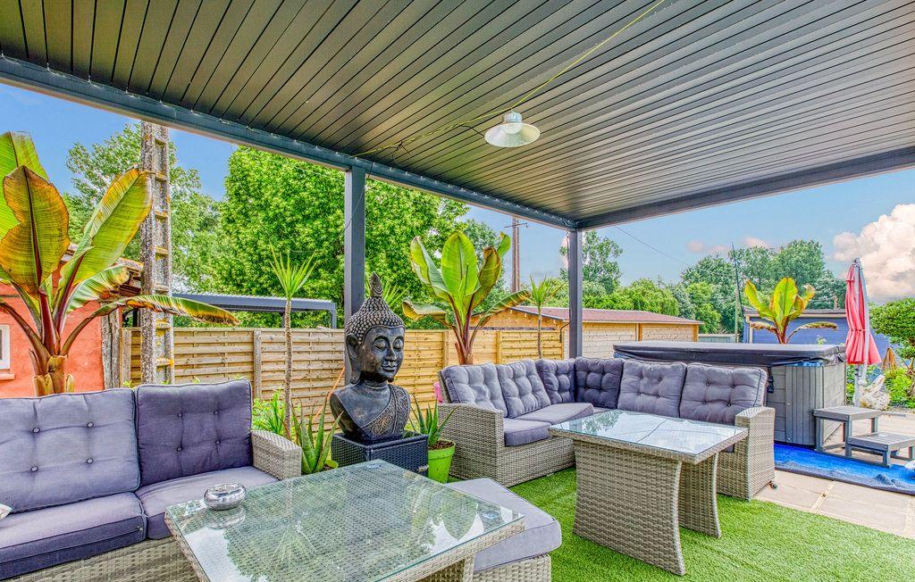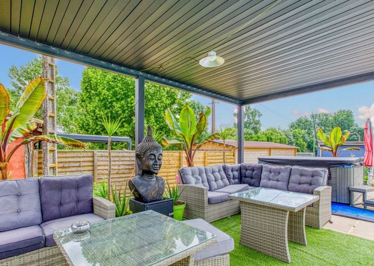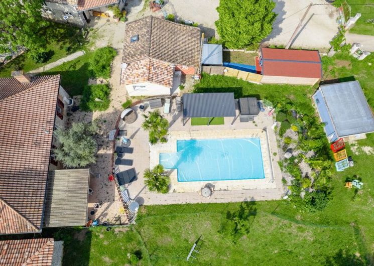 After a few steps from the car park, access to the terrace, garden furniture and pergola. One step leads up to the living area (fitted kitchen: fridge, freezer, hob, oven, microwave) with table and chairs. After 4 steps, the bedroom with 1 x 160 x 200 bed, sofa and TV. Bathroom with shower and bath, washing machine and tumble dryer. Bed linen and towels provided, included in the price. Free Wi-Fi in the accommodation. Essential oils for the Hammam. Bathrobes provided. From 1 May to 31 October, access to the shared swimming pool and spa.