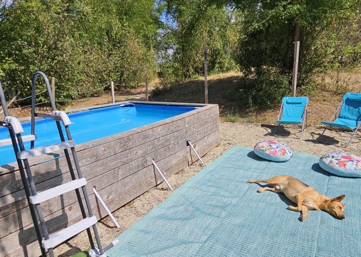 Outside: a well-designed terrace (outdoor dining and lounge area under shade cloth), a tubular pool (4×2 m, 0.80 m deep), a plancha grill, and access to the clubhouse leisure area (babyfoot, billiards). A simple, lively, and welcoming place for a holiday in the rural Tarn.