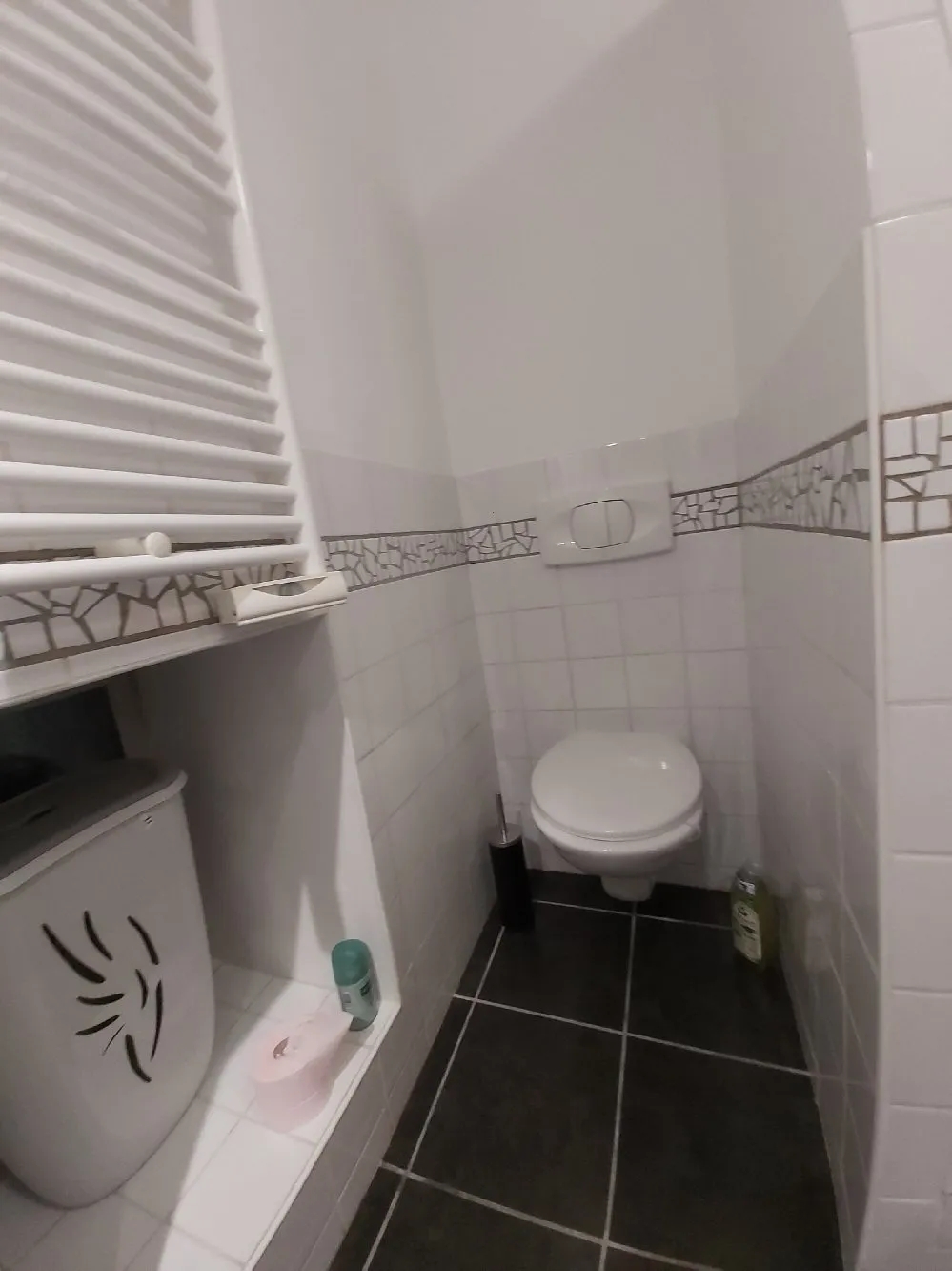 – d’une salle d’eau avec douche (porte en verre), meuble-vasque, lave-linge et WC suspendu,
