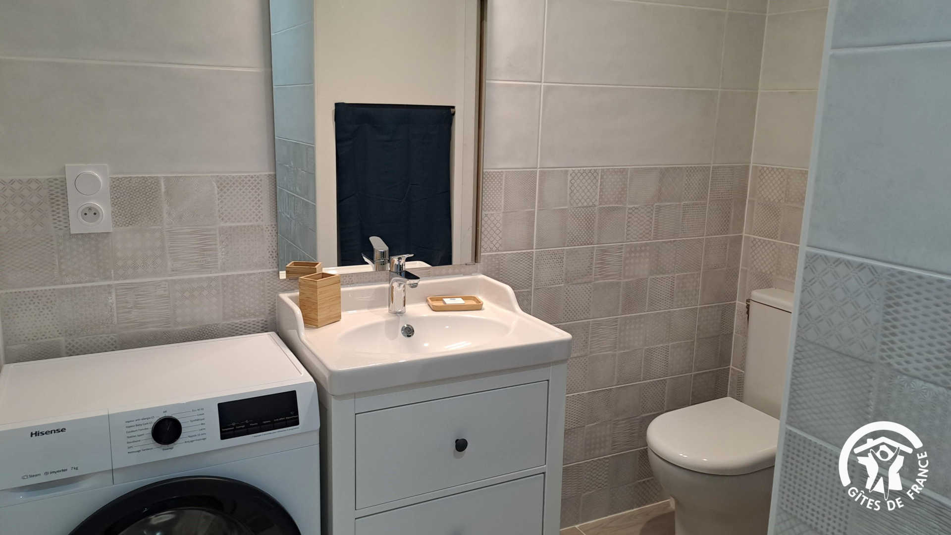 Petite salle d’eau avec grande douche, WC, vasque et lave-linge.