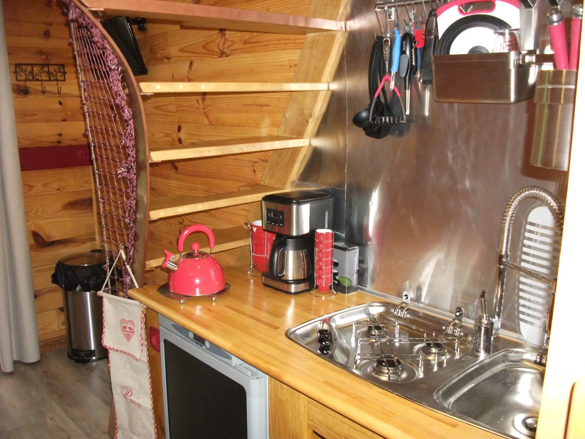 Le coin cuisine est équipé d’une plaque chauffante 3 bouches à gaz ; une hotte aspirante ; un réfrigérateur avec frezzer ; cafetière et bouilloire ; chauffage
