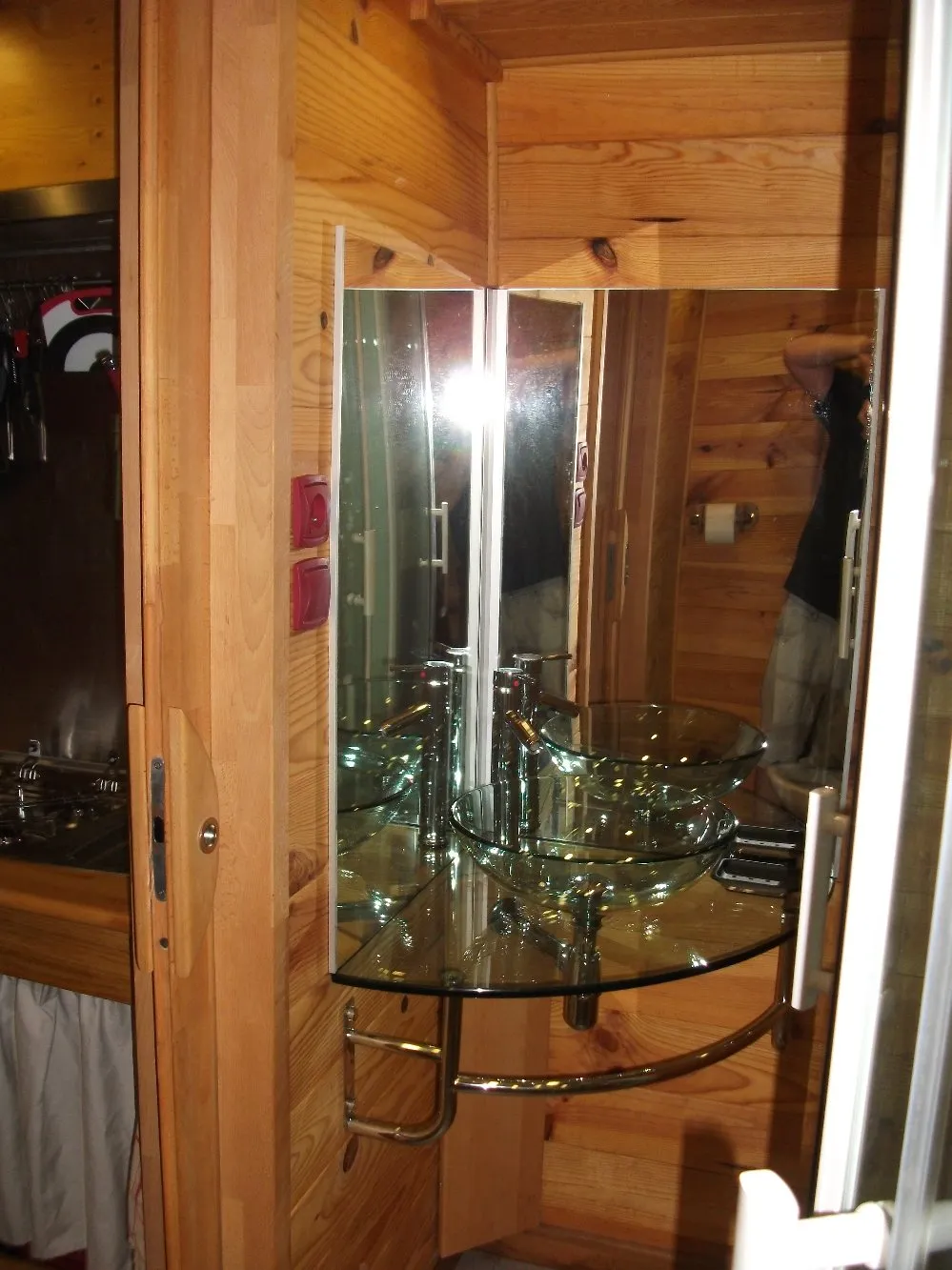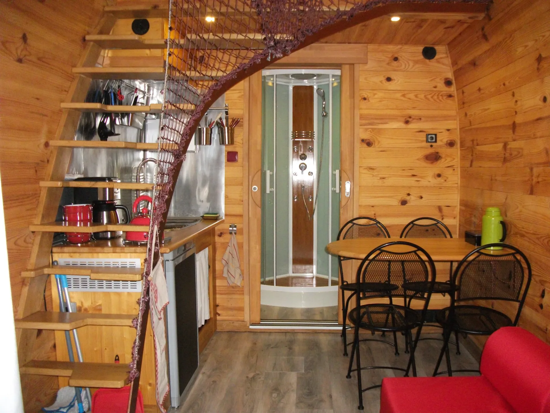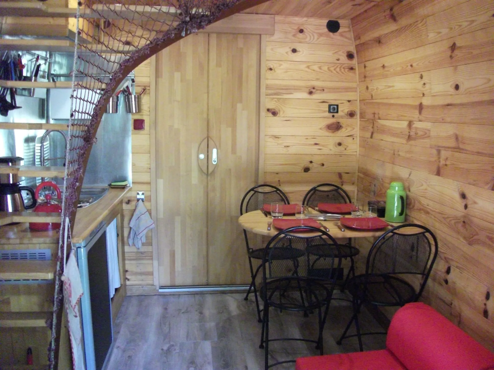 Hébergement agencé pour le gain de place (14 m2), prévu pour 2 adultes avec 2 enfants maximum ou 4 adultes à l’extrême