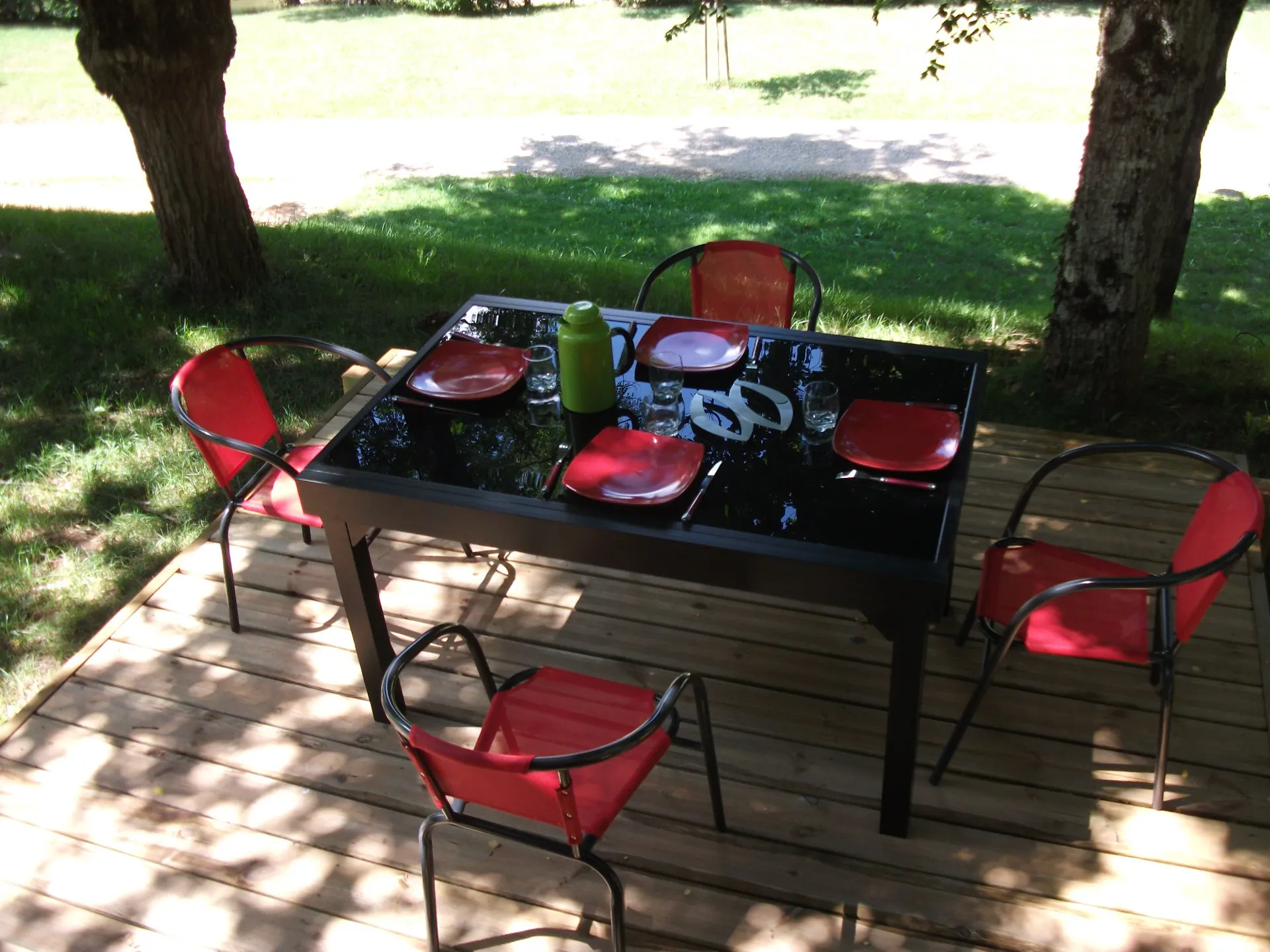 Terrasse de 9 m2 avec table et chaises de jardin et 2 transats