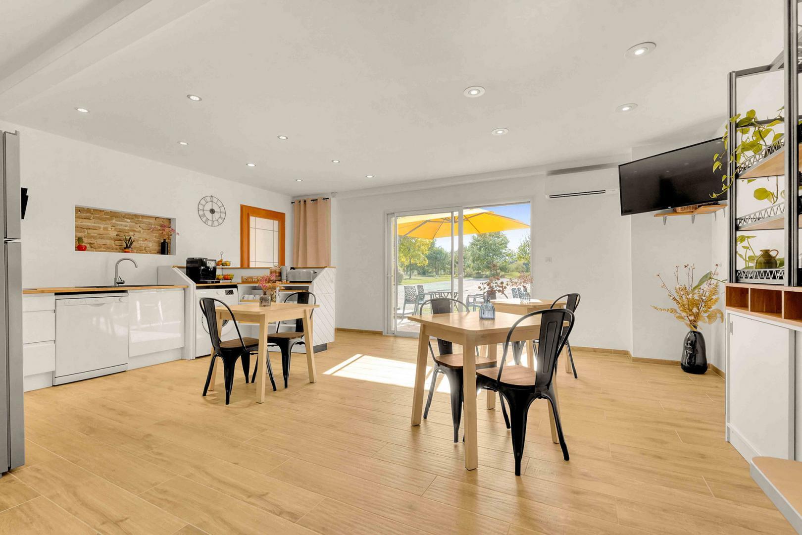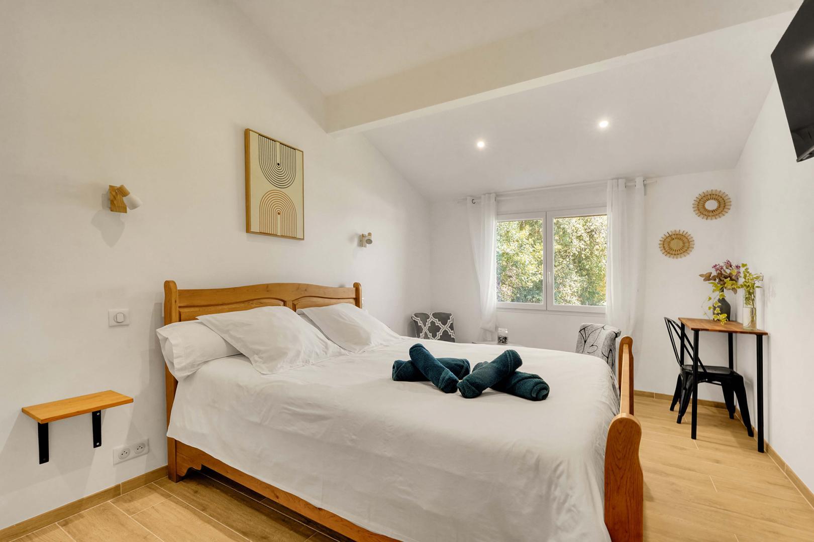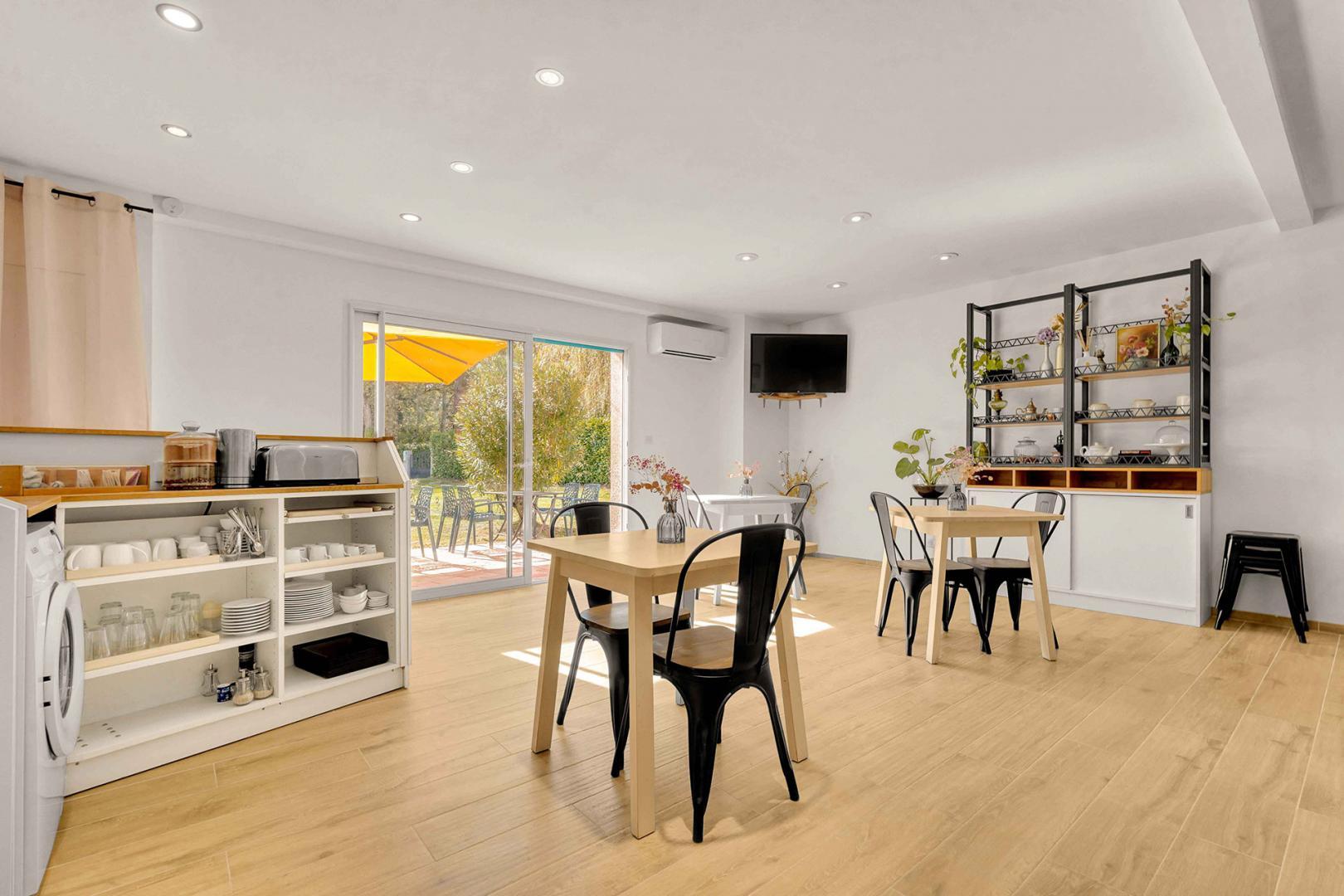 On entering the Maison d’Hôtes, you will discover the breakfast room with access to a shared kitchen and a small sitting area with flat-screen TV. 2 double bedrooms are on the ground floor and 2 other bedrooms are upstairs. Each room has a sitting area, flat-screen TV, reversible air conditioning, storage space for your belongings, a courtesy tray and full bathroom facilities (shower, washbasin and WC, separate in the upstairs rooms, in the downstairs shower room).