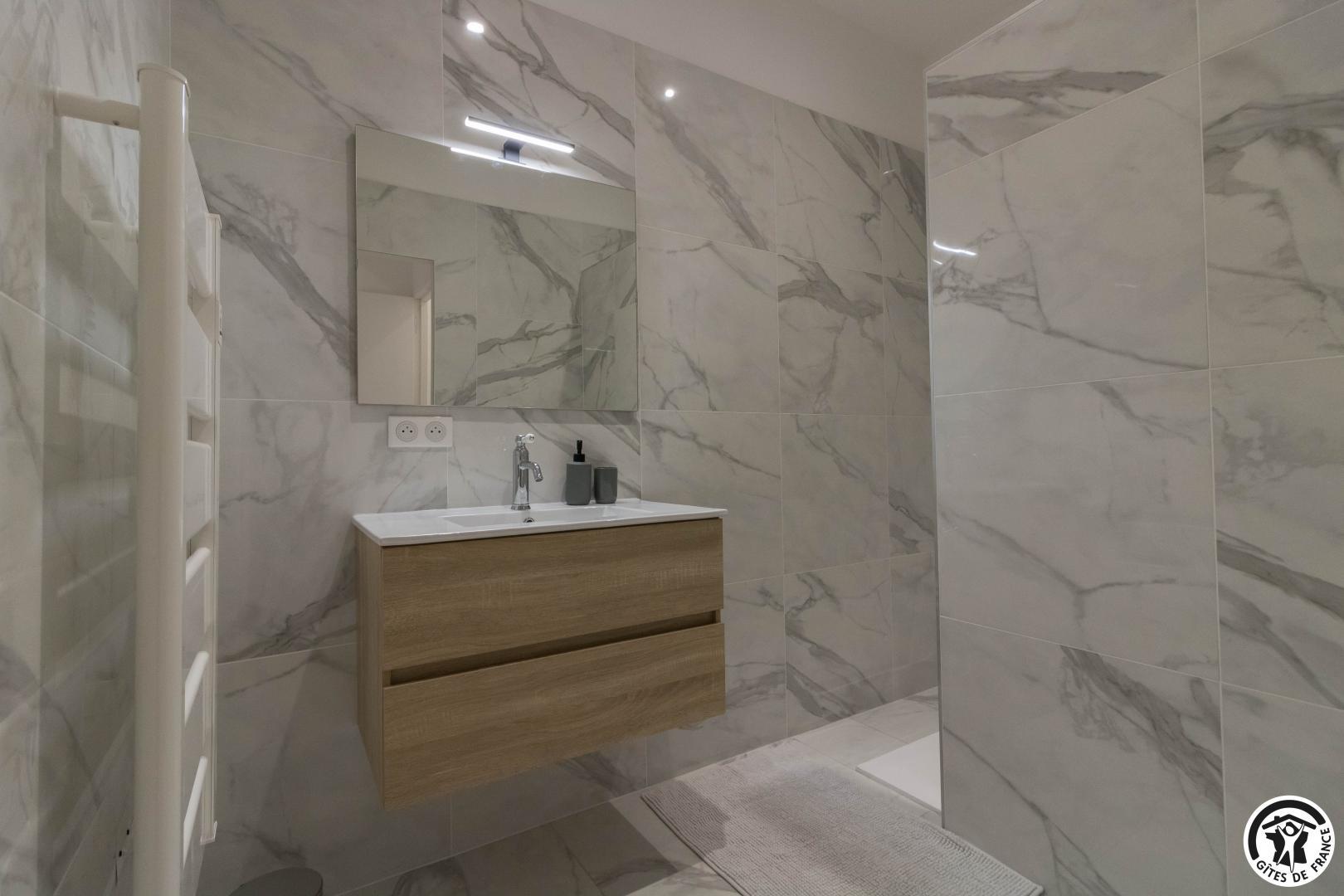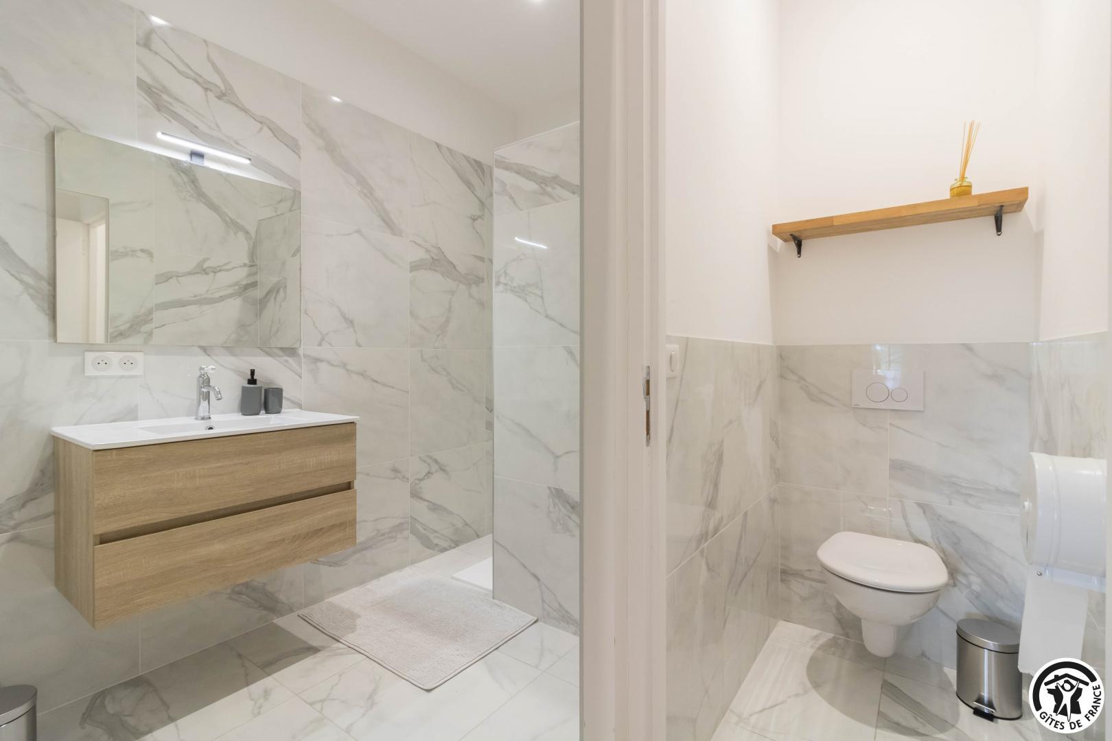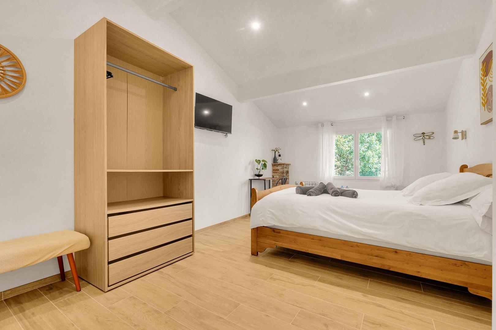 On entering the Maison d’Hôtes, you will discover the breakfast room with access to a shared kitchen and a small sitting area with flat-screen TV. 2 double bedrooms are on the ground floor and 2 other bedrooms are upstairs. Each room has a sitting area, flat-screen TV, reversible air conditioning, storage space for your belongings, a courtesy tray and full bathroom facilities (shower, washbasin and WC, separate in the upstairs rooms, in the downstairs shower room).