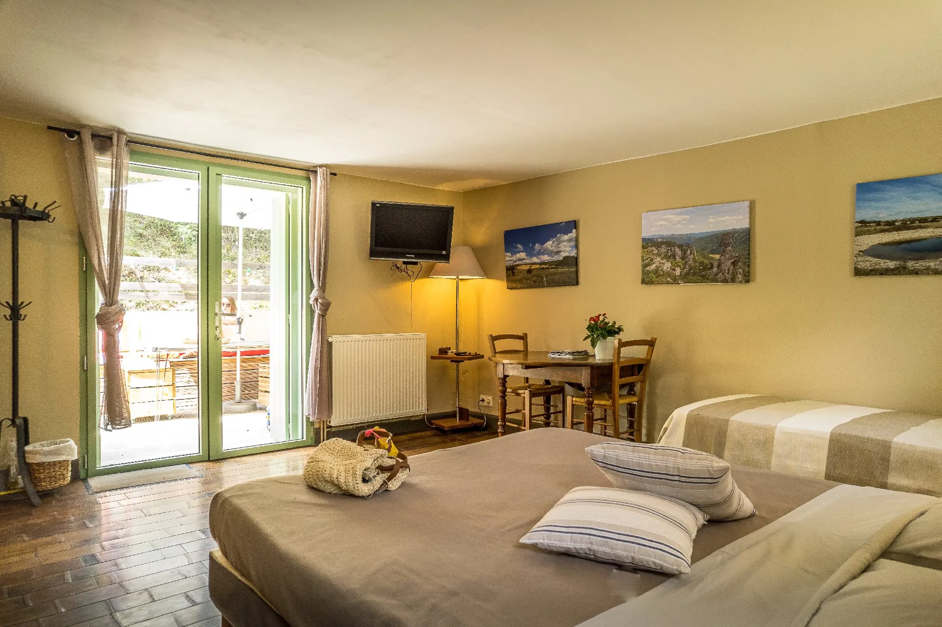 Chambre Eau : Cette chambre est largement ouverte sur la rivière ; une grande baie vitrée laisse entrer le soleil et donne accès sur le jardin avec une superbe vue sur les falaises qui surplombent la Dourbie. Le bercement du bruit de l’eau est tout proche mais une bonne insonorisation de la pièce vous garantit également un sommeil paisible. La chambre dispose de 2 lits de 80×200 ou 1 lit de 160×200.
