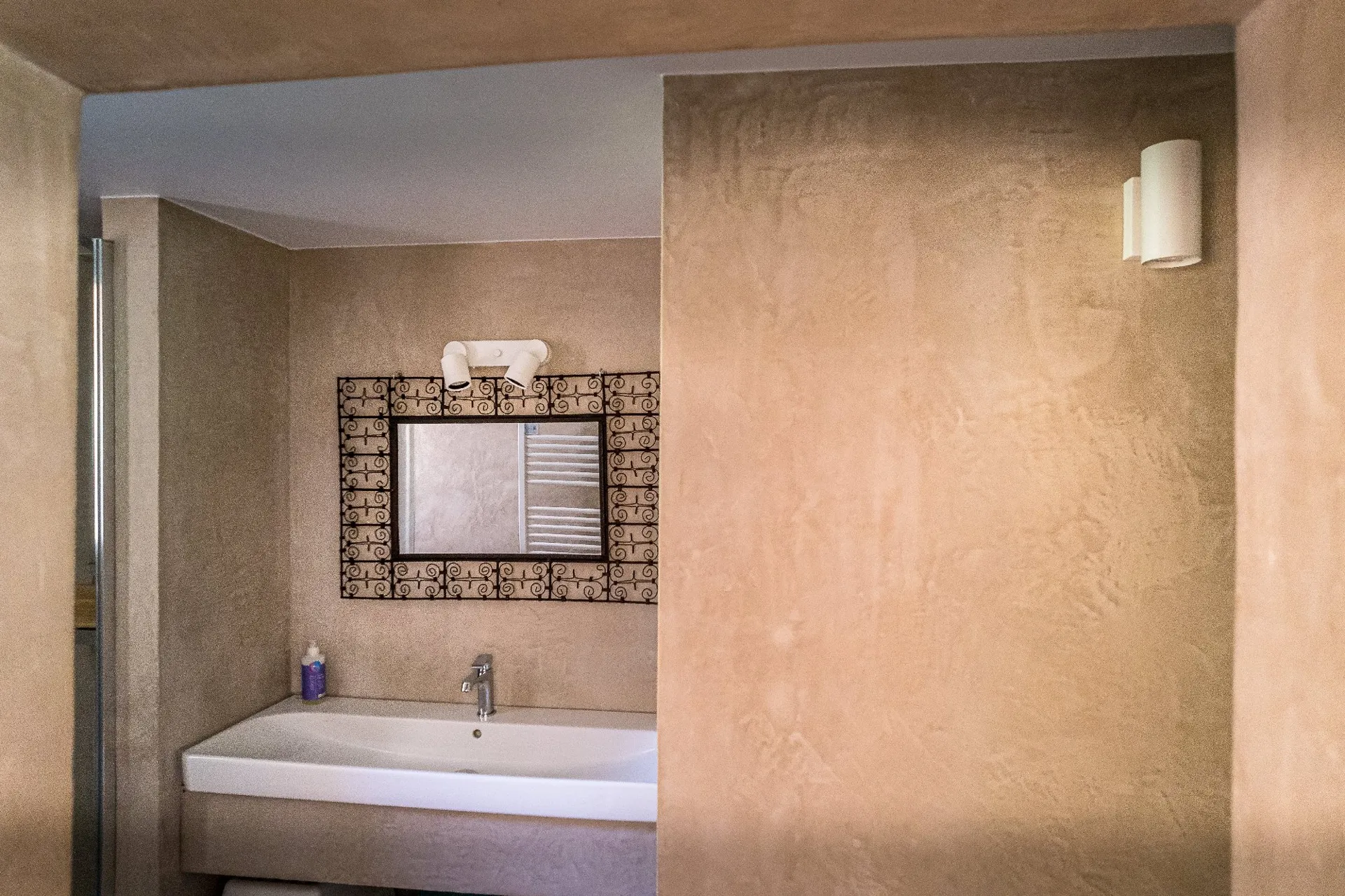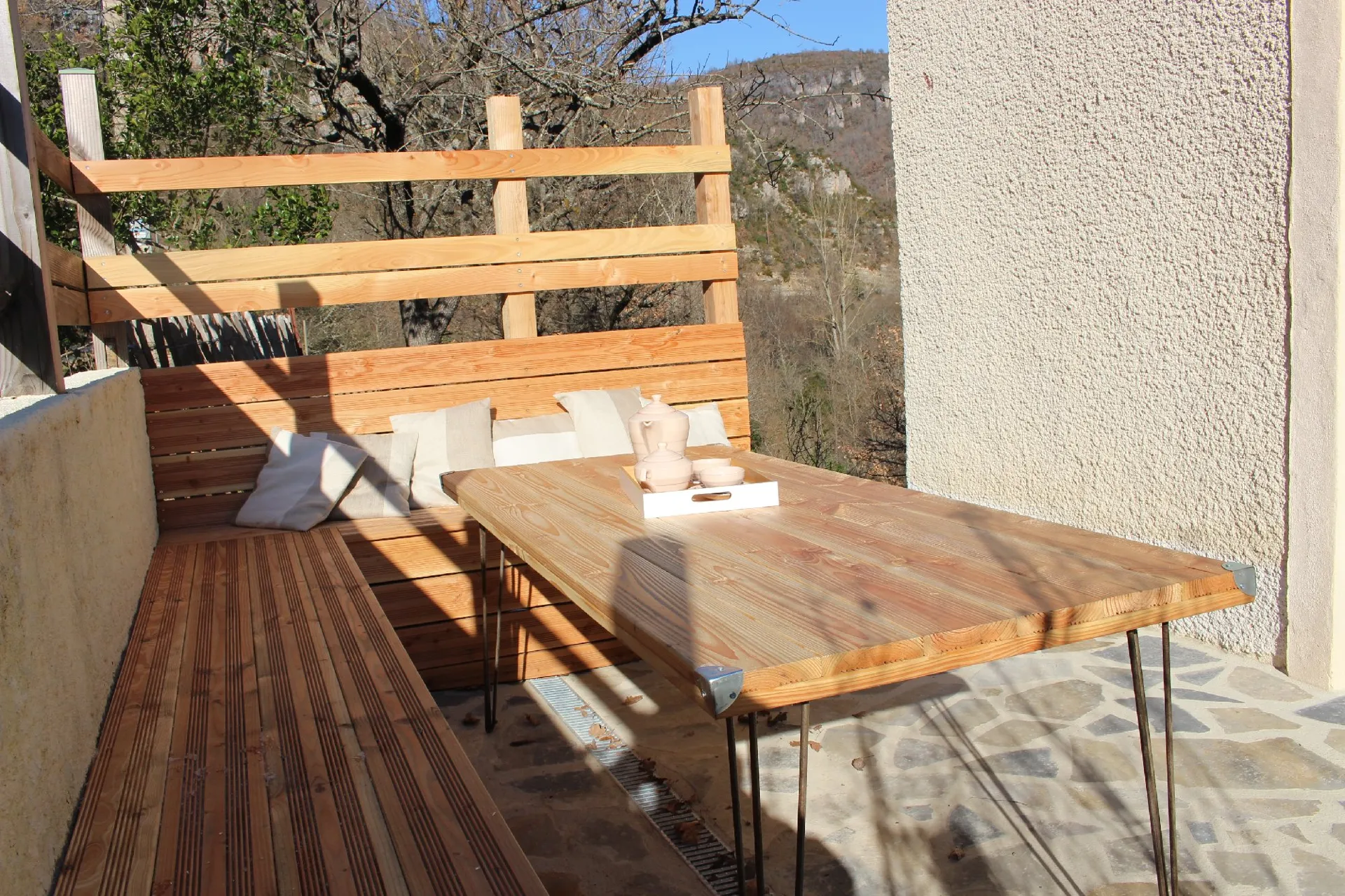 Chambre Air : C’est la chambre la plus spacieuse. Elle offre à la fois une vue sur le Causse du Larzac et de l’autre côté sur la rivière et le Causse Noir. Elle bénéficie d’une grande terrasse fleurie. La chambre “Air” peut accueillir une petite famille grâce à son grand lit double (160×200)et son lit simple (80×200) ainsi qu’un lit bébé sur demande. On imagine difficilement que cette pièce était en réalité la cuisine de la maison. Fraîche en été, chaleureuse en hiver, on s’y sent bien ! Télévision satellite