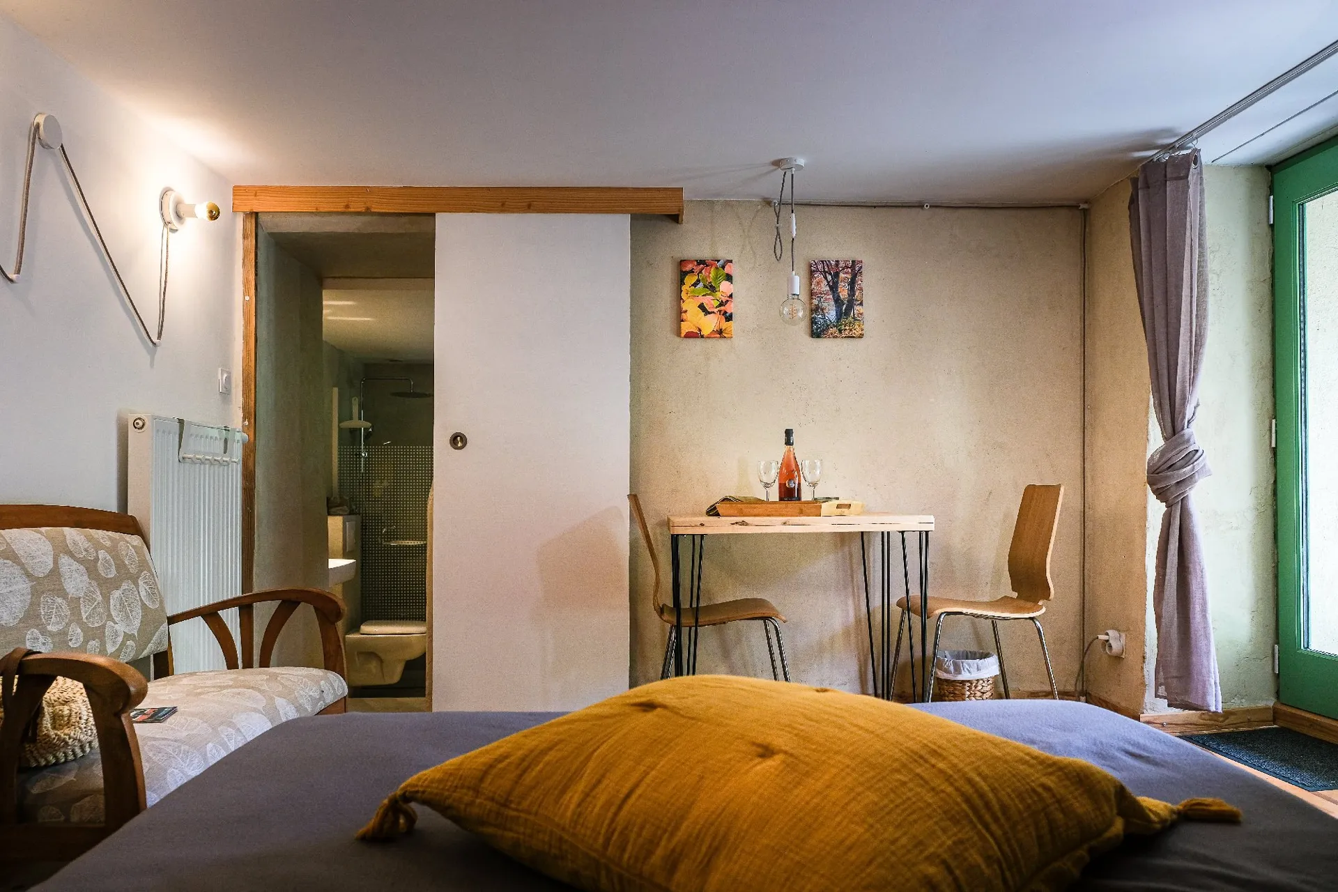 Chambre Terre : Cette chambre reste fraiche en été et offre une ambiance cocoon en hiver. Très silencieuse, elle est également en contact direct avec le jardin et permet un accès à la rivière. Vous profiterez de sa terrasse ombragée et fleurie. Lit de 140/190.