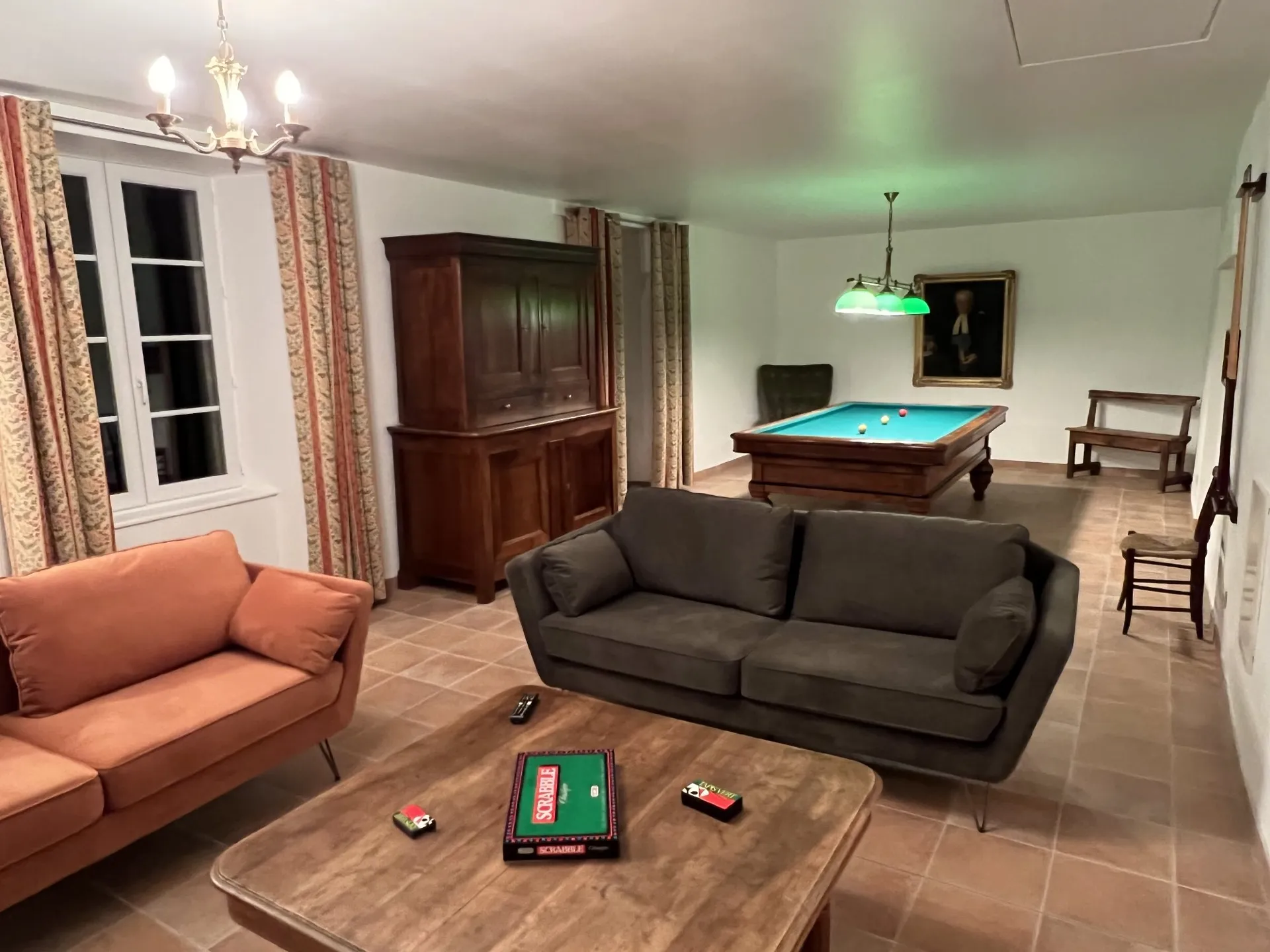 En partie sous voute et située au 3ème étage, cette suite familiale de 92 m² est composée d’une chambre avec 1 lit double (180×200), d’une chambre avec 3 lits simples (90 x 200cm), d’une salle d’eau (douche à l’italienne) avec WC et d’un salon privatif avec billard Français.