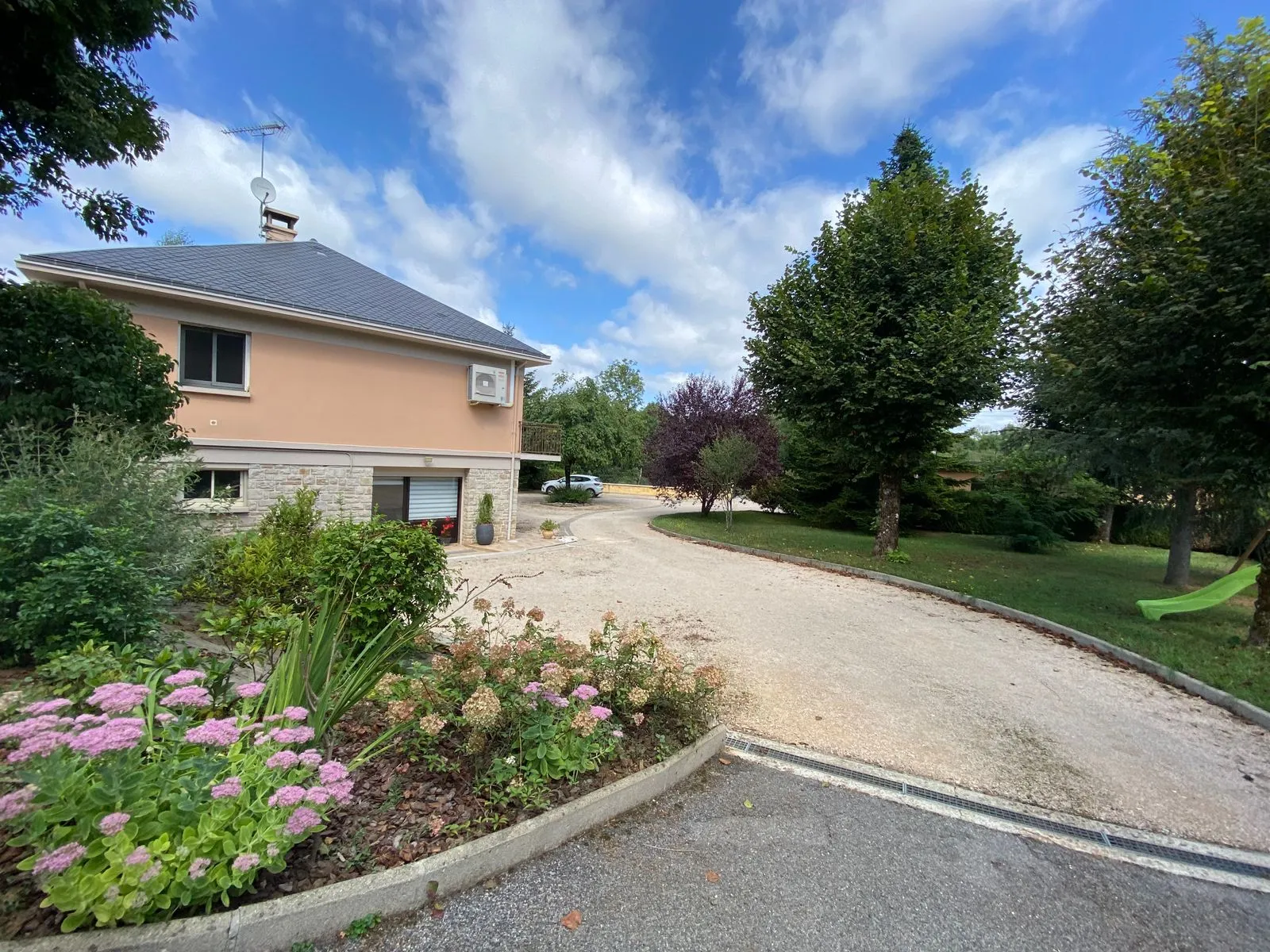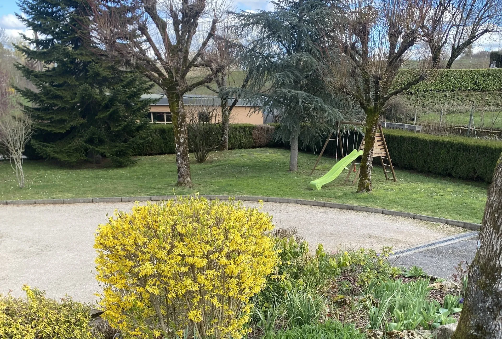 Grande cour arborée et clôturée avec jeux pour enfants. Possibilité d’abriter des vélos dans un local.