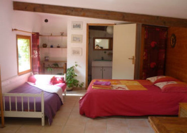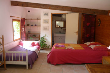 Nestling in a haven of peace, we make the most of a unique setting in the middle of nature, where you will have time to enjoy the place and rest with complete peace of mind, with way-marked footpaths starting from the house. The room is in a building which is separated from our house and is composed of a warm room with a floor surface of 28m2, and its bathroom, knowing that we have opted for dry toilets. There, we offer on booking a vegetarian diner for 12,50€ (Fridays and Saturdays only, cooked with ingredients that are mostly organic, local or coming from our garden according to the season) .
