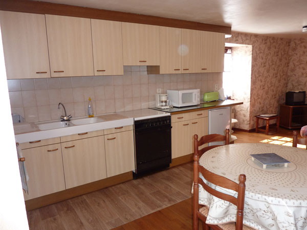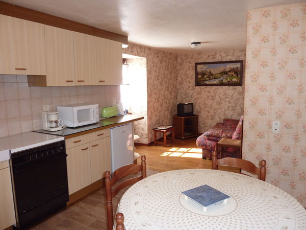 Rez de chaussée surélevé : cuisine intégrée avec coin repas et espace salon (canapé clic-clac) – 1 chambre – salle d’eau avec WC.