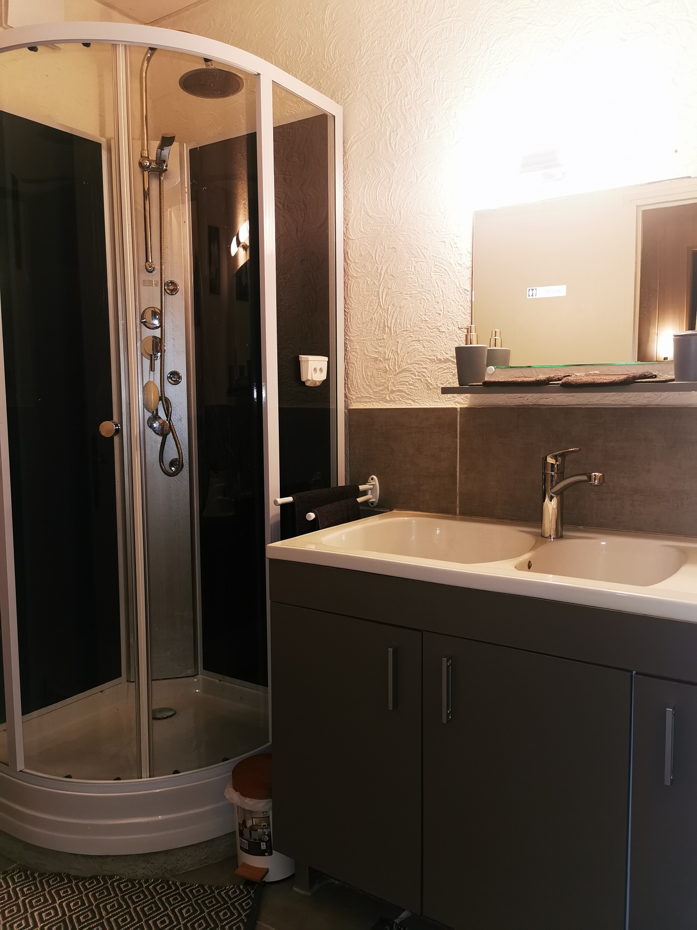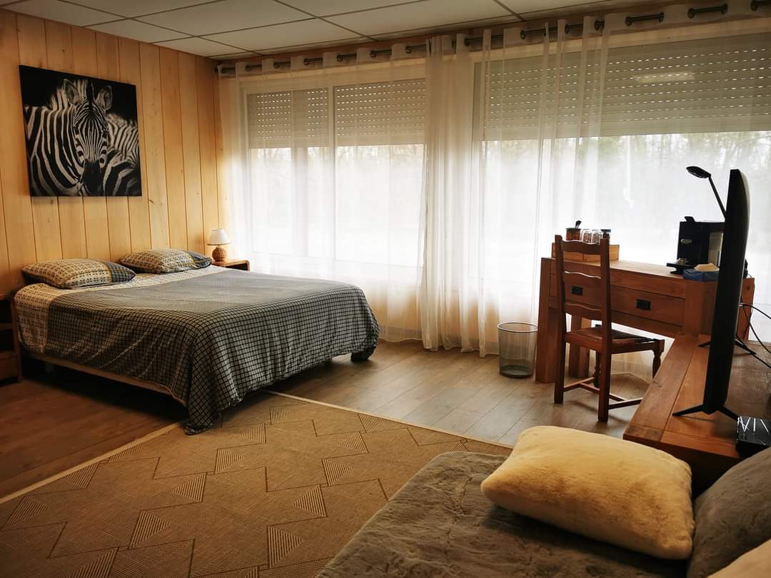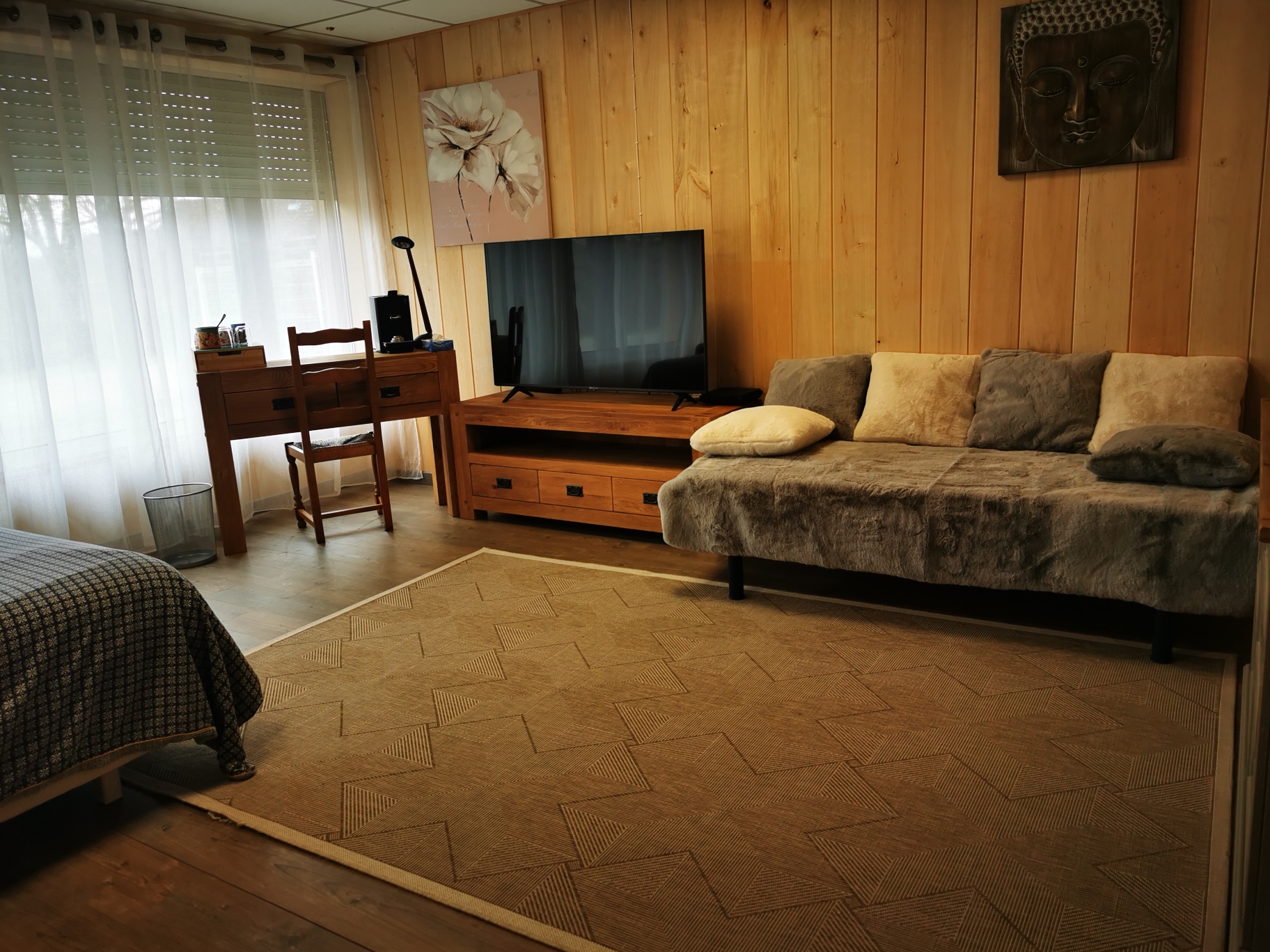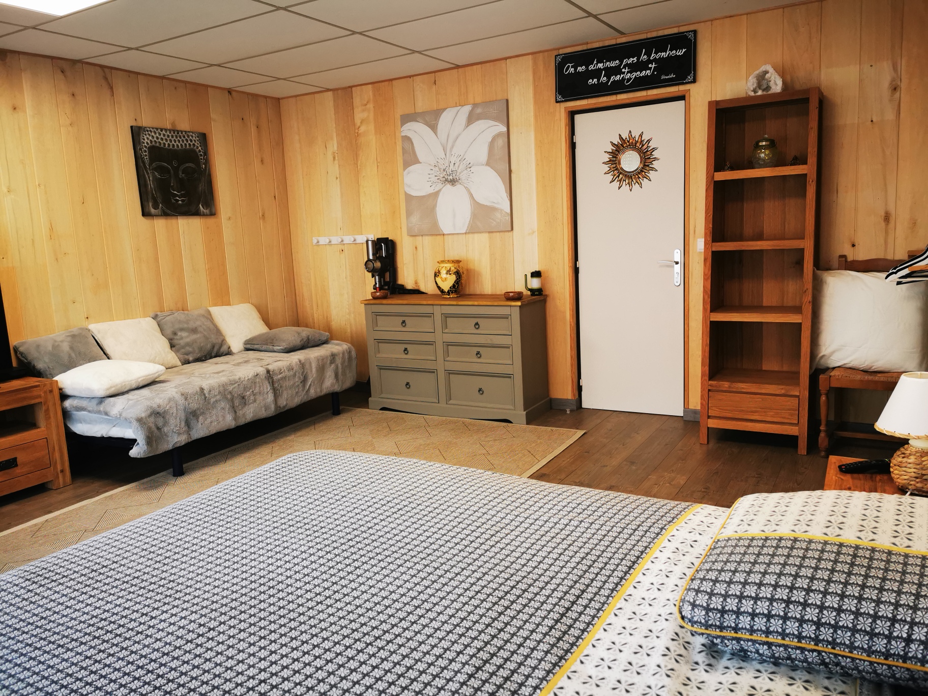 literie en 160 haut de gamme, canapé (lit en 90), possibilité lit bébé gratuit, un mini-frigo, une bouilloire, une machine à café, téléviseur écran plat (Netflix inclus), une douche, un wc, un lavabo, possibilité parking fermé sur demande, wifi, chauffage électrique, restaurant à 100m, chambre non fumeur.