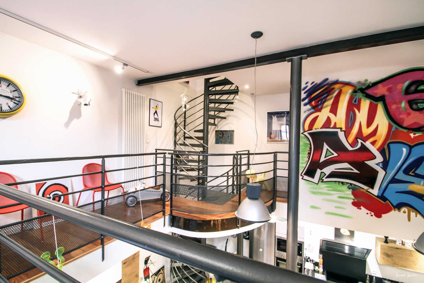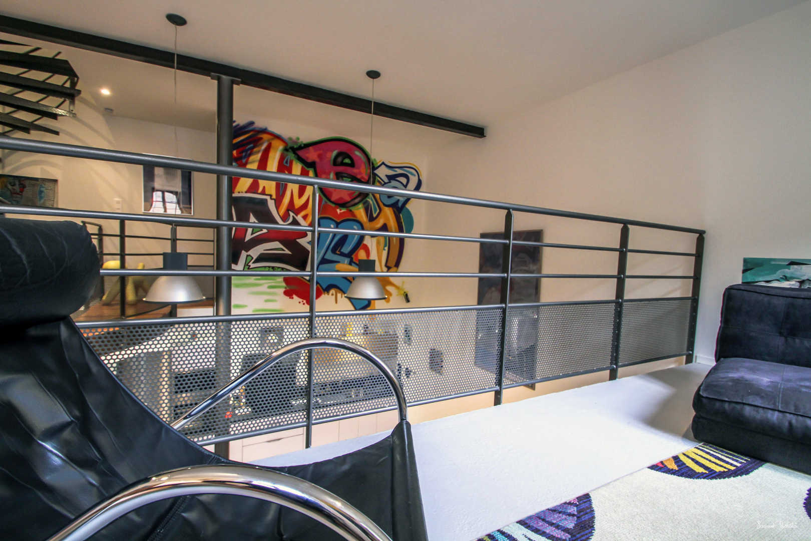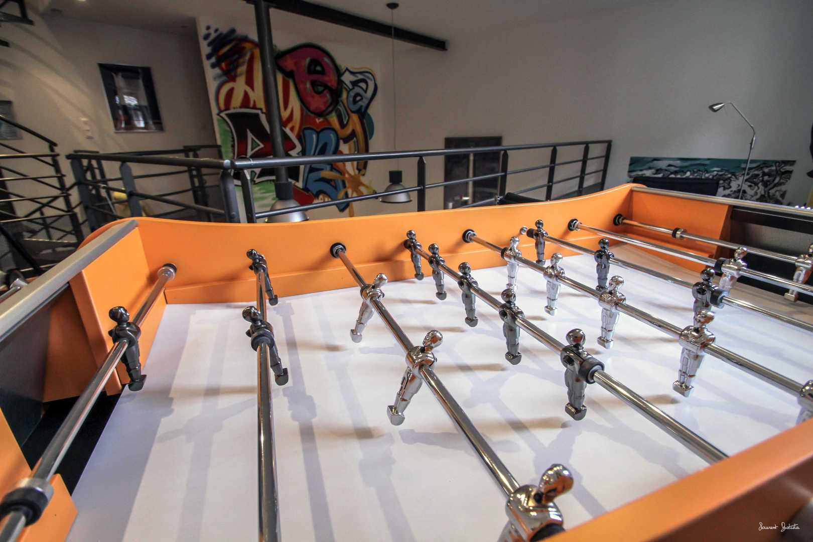 * Niveau 1 : une passerelle depuis laquelle vous dominez le salon, coin détente, babyfoot, wc.