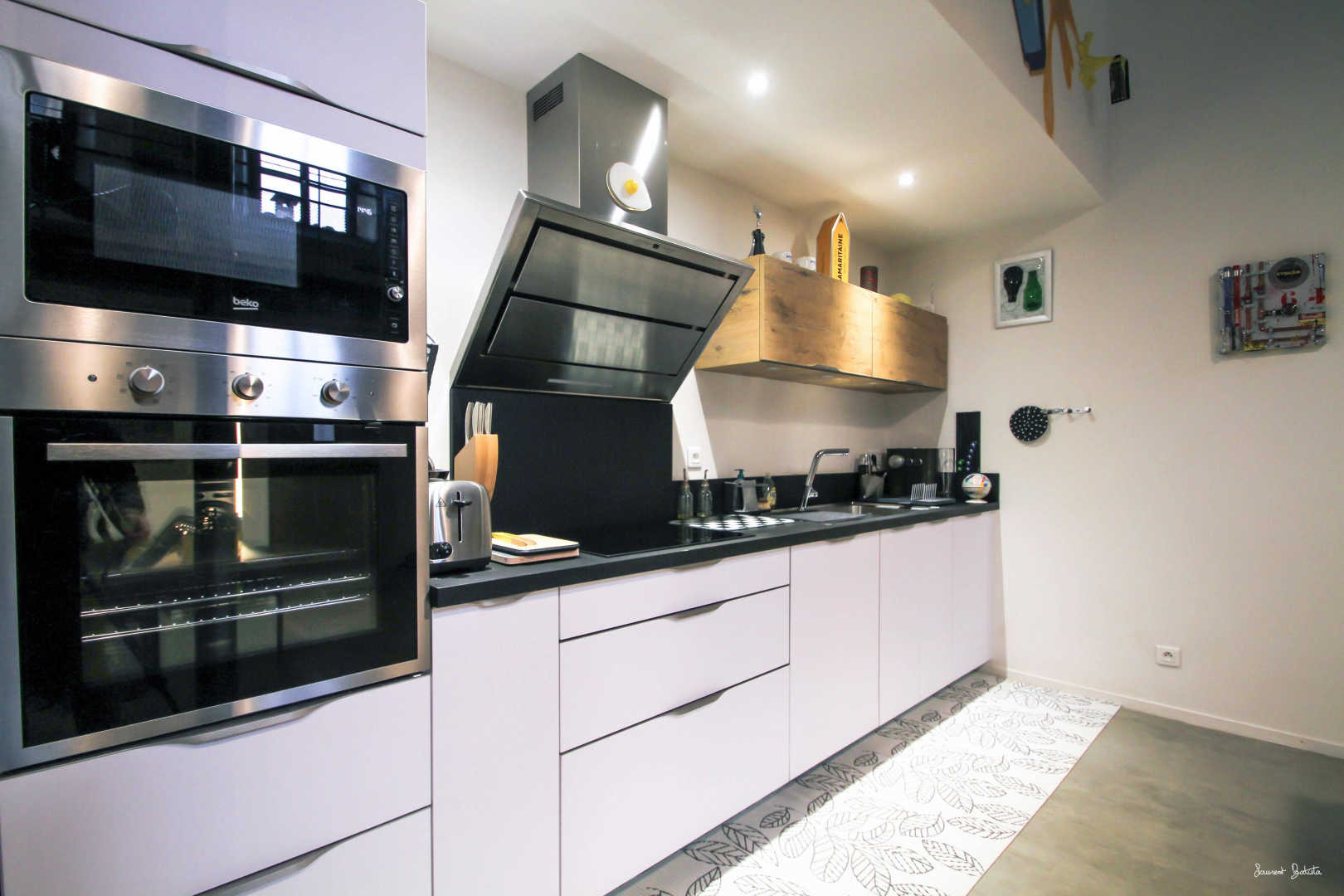 * Rez de chaussée : pièce à vivre, coin salon, cuisine ouverte toute équipée et toute neuve (réfrigérateur, micro-ondes, lave-vaisselle, plaque induction, four, petit électroménager (bouilloire, presse agrumes…), cave à vins, lave-linge, canapé lit.