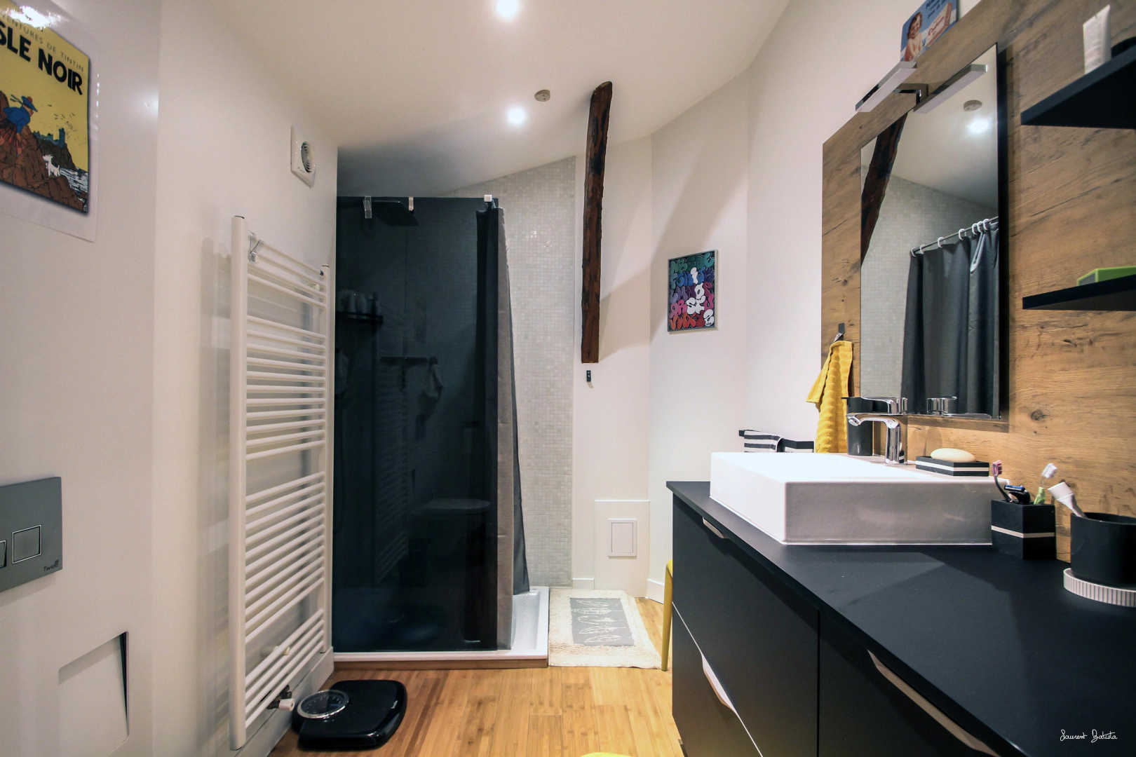 * Niveau 2 : grande chambre avec lit 160×200, salle d’eau (douche, wc).