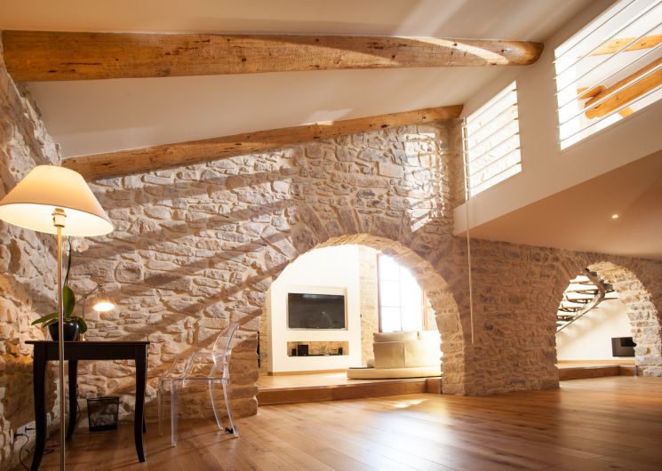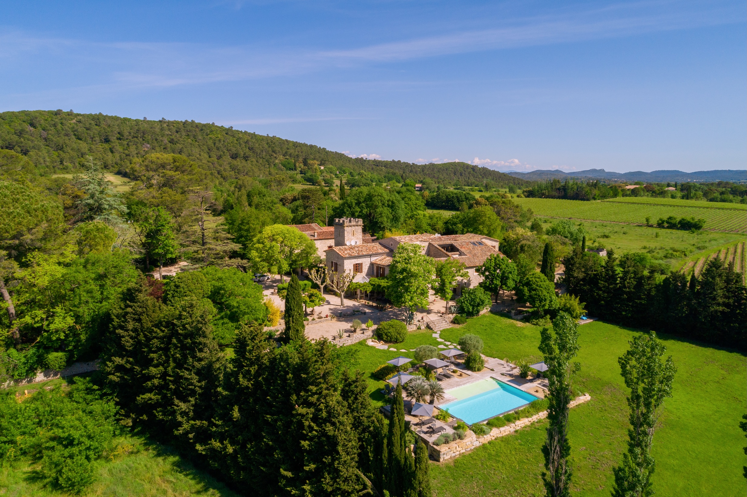 In absolute peace and quiet, set in 5 hectares of parkland amidst vineyards, the complex is a former 9th-century priory converted into a hamlet of contemporary-design gîtes: lofts, detached stone houses and even an architect-designed villa with spa and private heated pool.