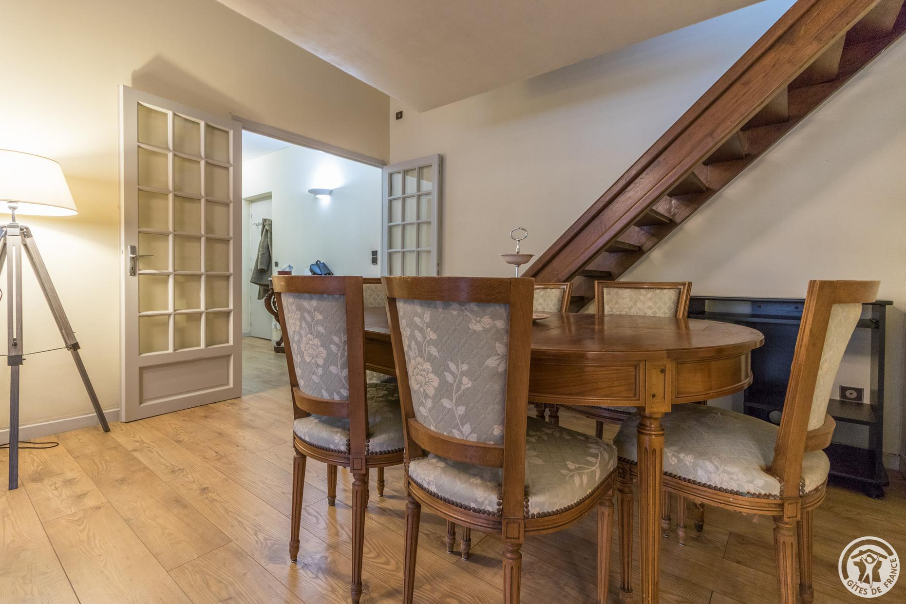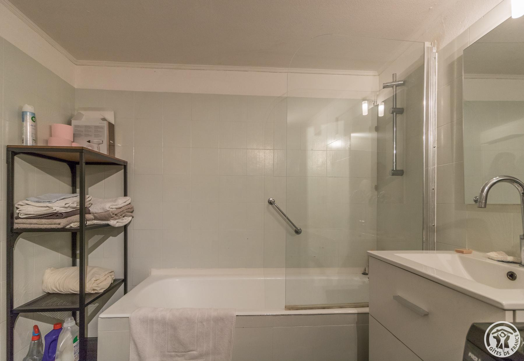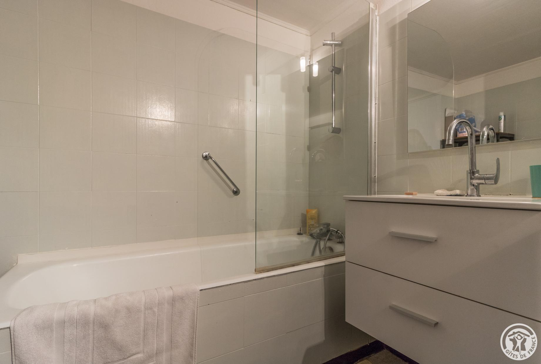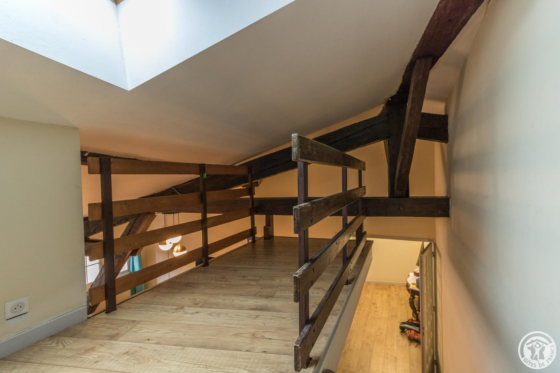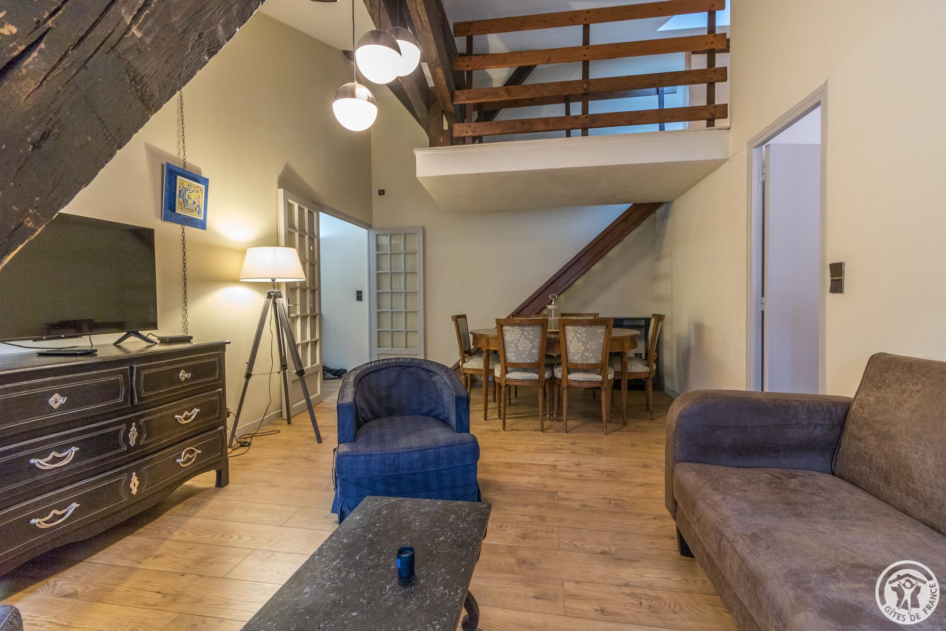 The accommodation is 62m2: entrance, fitted kitchen with small dining area (4 gas rings, oven, microwave, fridge-freezer and dishwasher), living room with dining area and sitting area (TV, desk), bedroom (2 single beds 90*190cm which can be combined to form 1 double bed 180*190cm), bathroom/WC (bath and washbasin). A double bed is available on the mezzanine, which has very low ceilings (steep staircase). Gas central heating. Wifi internet connection.