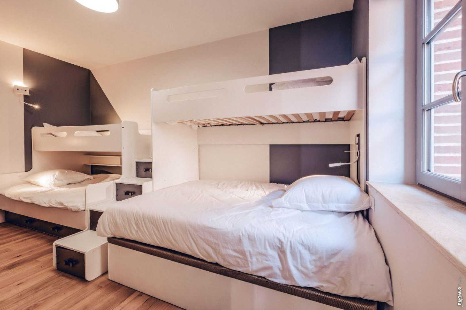 * L’espace qui ravira les enfants : un lit en 140cm avec un lit 80cm au-dessus; et un second lit superposé en 120cm en bas, 80cm au-dessus et lit-tiroir en 90cm si besoin.