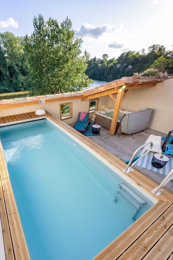 Depuis la terrasse, escalier en colimaçon pour accéder à la PISCINE en bois, ouverte toute l’année de 1,20m de profondeur et 6×2,50m. Dans cet espace, vous profiterez aussi du SPA 6 places (payant).