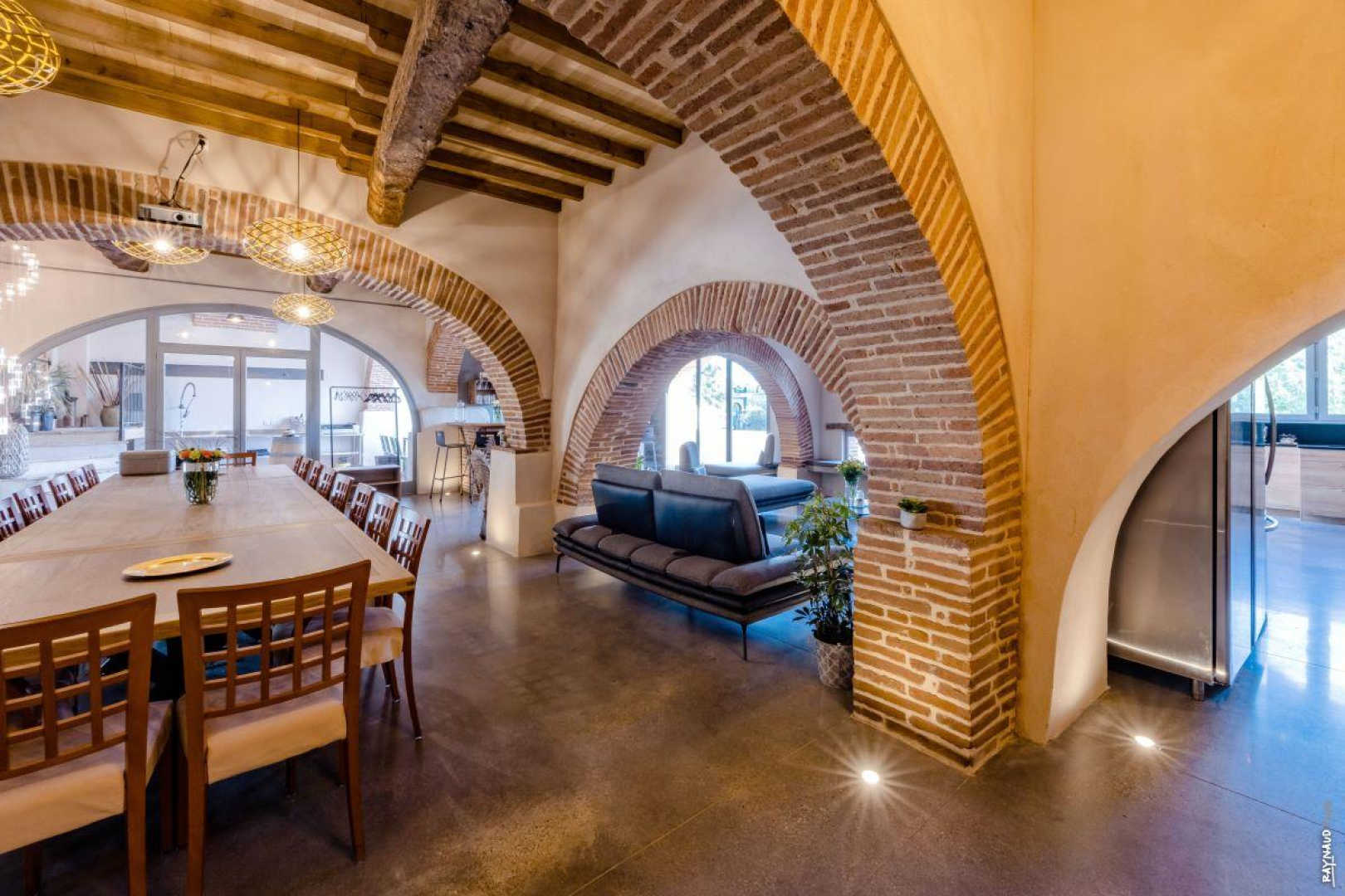 – grand séjour sous les arcades avec espace salon et TV. Grande table à manger pour 15 personnes, idéale pour les repas de famille ou entre amis, mais aussi parfait pour des SÉMINAIRES avec vidéoprojecteur et bar tout équipé pour l’accueil de groupes. Wc indépendant.