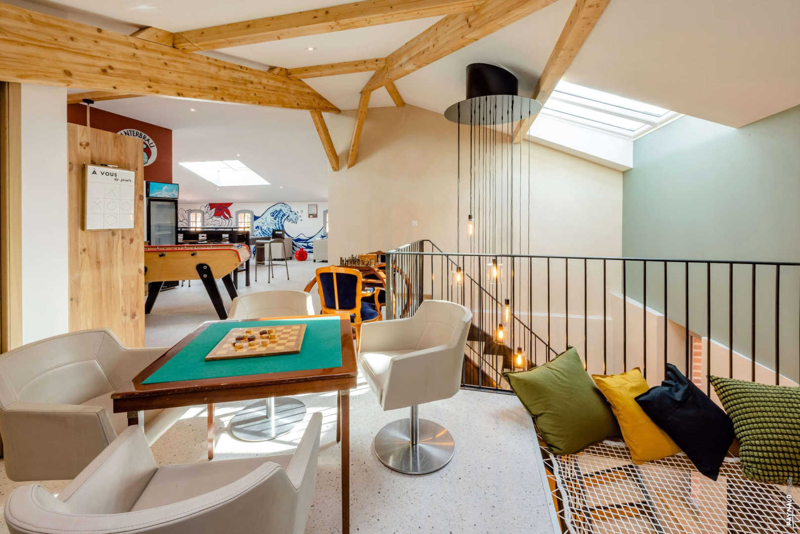 Au 2e étage, l’espace loisirs et détente : en haut des escaliers, BABYFOOT, échiquier, fléchettes, BILLARD et WC indépendant au second étage avec bar (machine à glaçons, cafetière, évier).