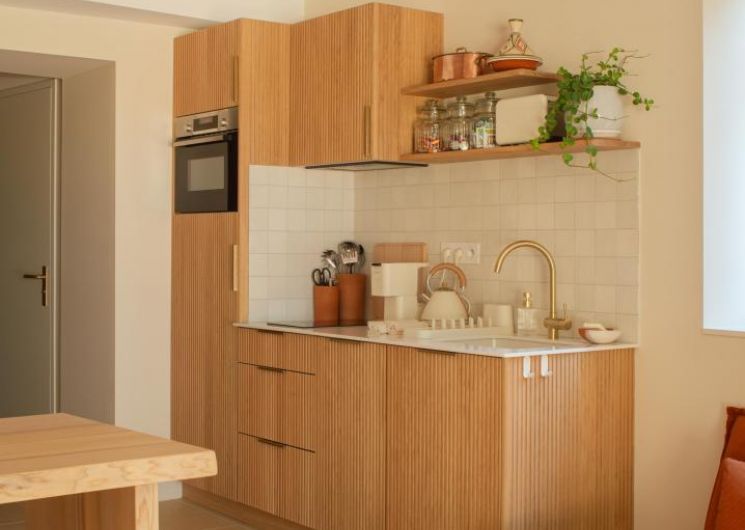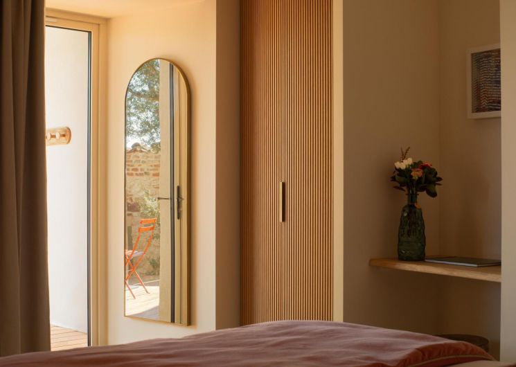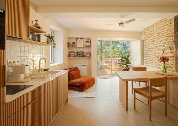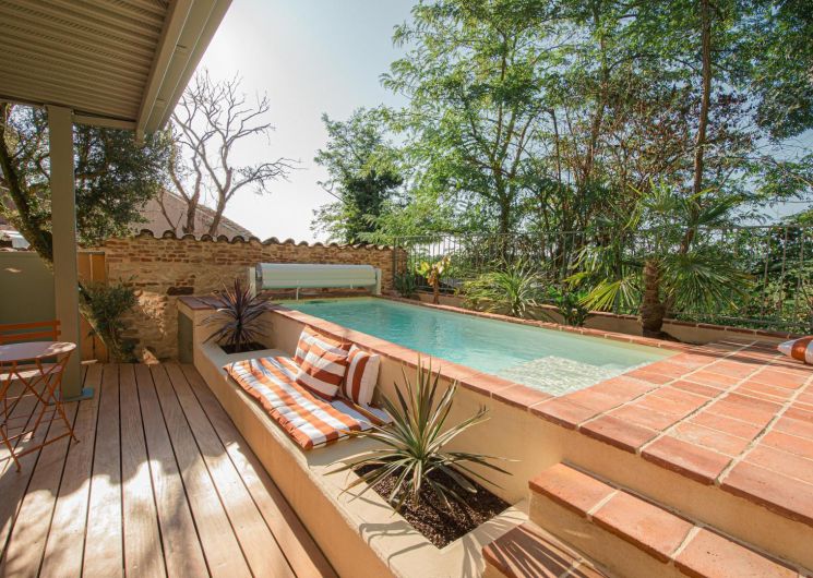 At the bend in the cobbled streets of Castelviel, stands a discreet and narrow facade. At first glance, nothing suggests what lies behind this old door on Rue du Castelviel. It’s hard to imagine that beyond the old bricks lies a luminous cocoon of 45 m², extended by a secret garden with a swimming pool, and that in the background stretches the forest plunging towards the Tarn.