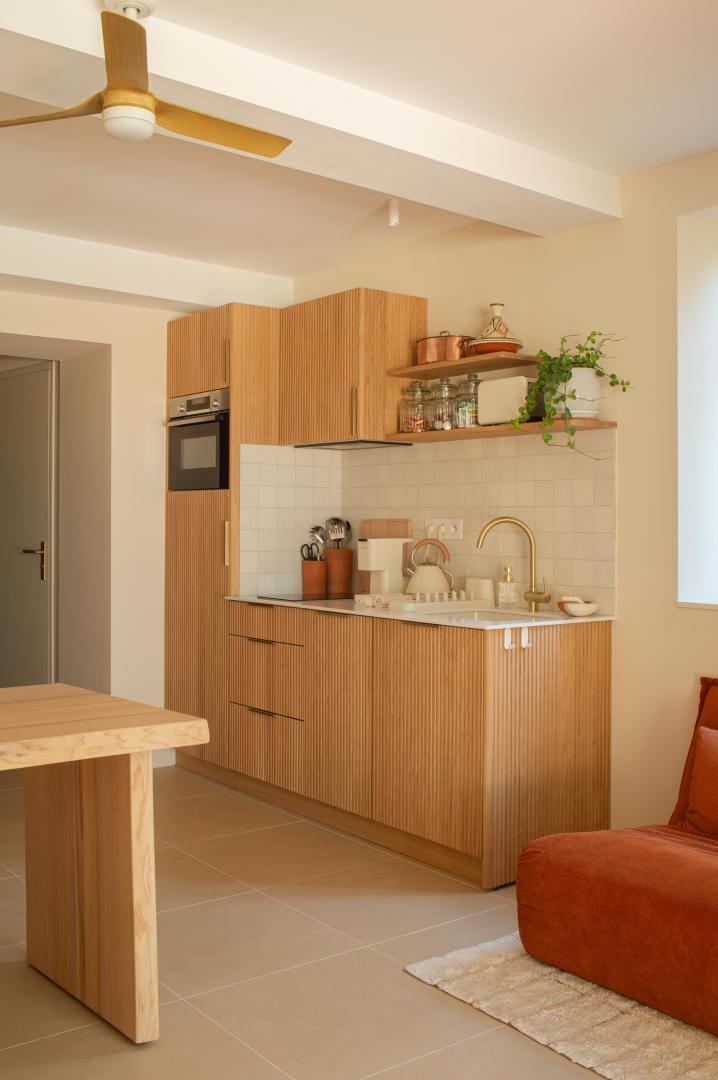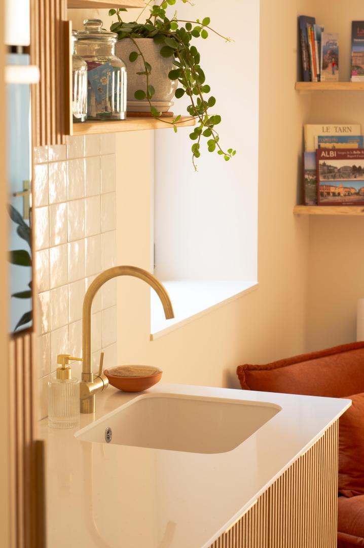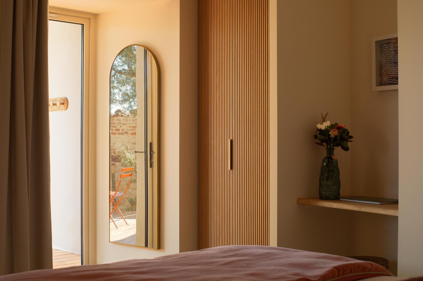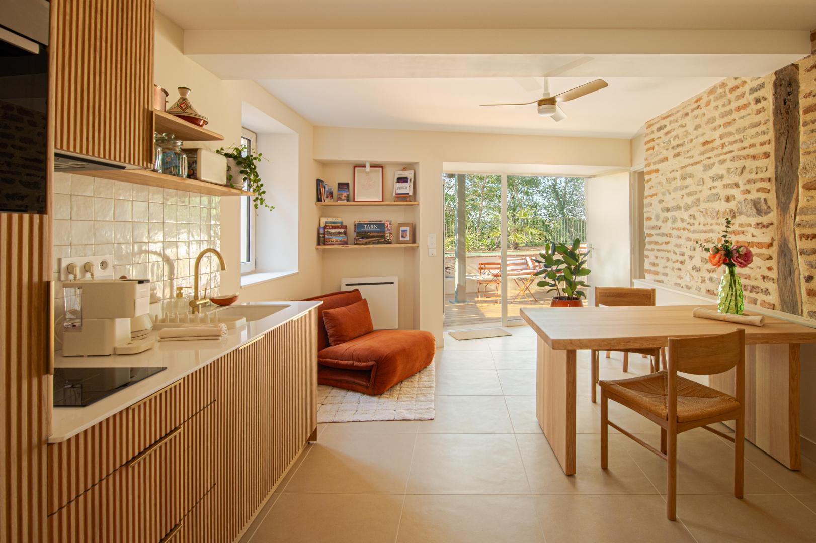 At the bend in the cobbled streets of Castelviel, stands a discreet and narrow facade. At first glance, nothing suggests what lies behind this old door on Rue du Castelviel. It’s hard to imagine that beyond the old bricks lies a luminous cocoon of 45 m², extended by a secret garden with a swimming pool, and that in the background stretches the forest plunging towards the Tarn.