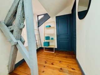 Rez-de-chaussée : – Petite entrée avec toilettes et machine à laver . – Nécessaire de ménage sous l’escalier . Premier étage : – Salon avec télévision (connexion fibre disponible) et canapé lit confortable avec matelas . – Cuisine avec réfrigérateur, cuisinière vitro, four micro-ondes, cafetière et bouilloire . Deuxième étage : – Chambre avec lit en 140 cm. – Chambre avec lit en 160 cm. – Petite salle d’eau avec toilettes.
