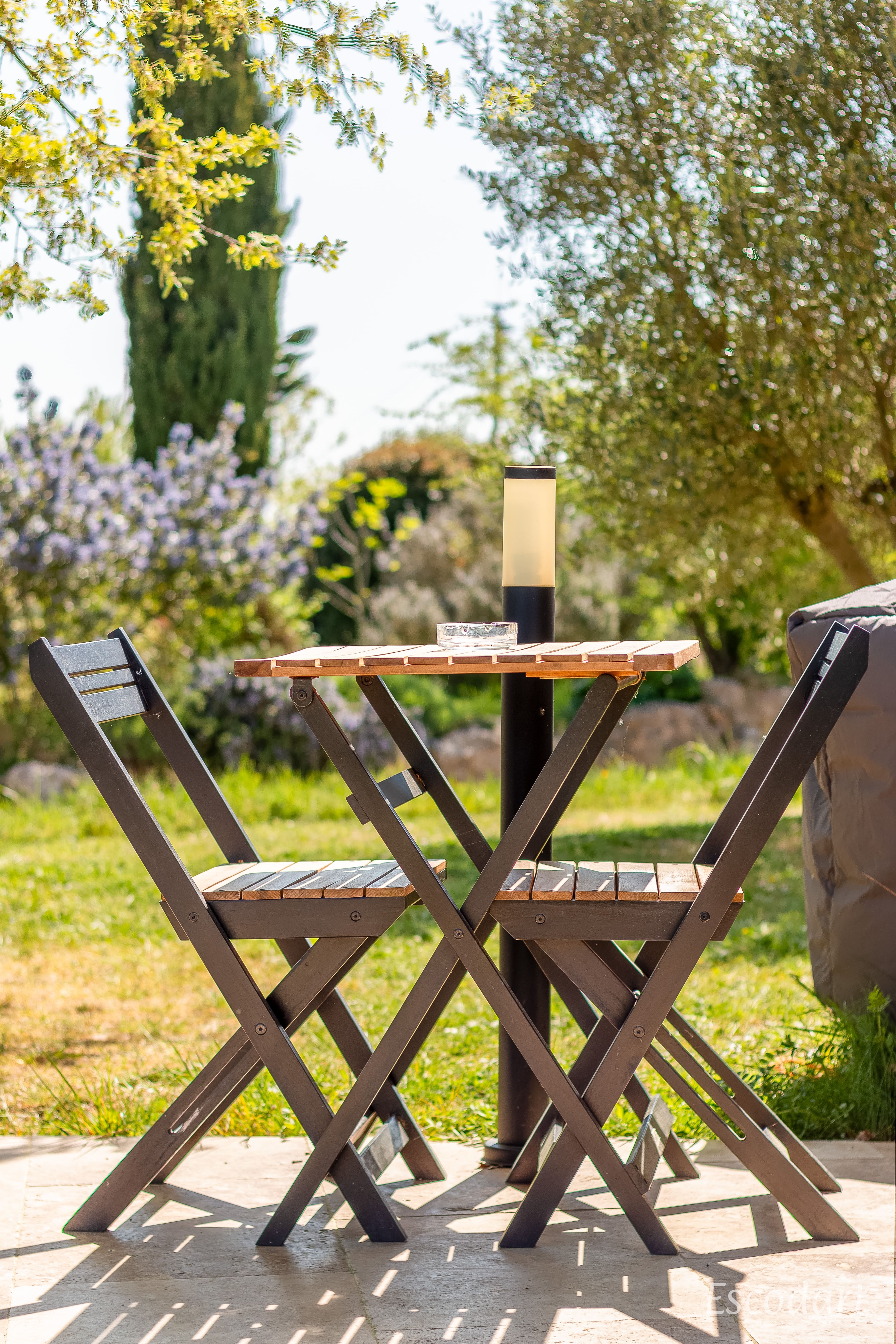 Terrasse avec table, chaises, chiliennes et hamac pour le repos.