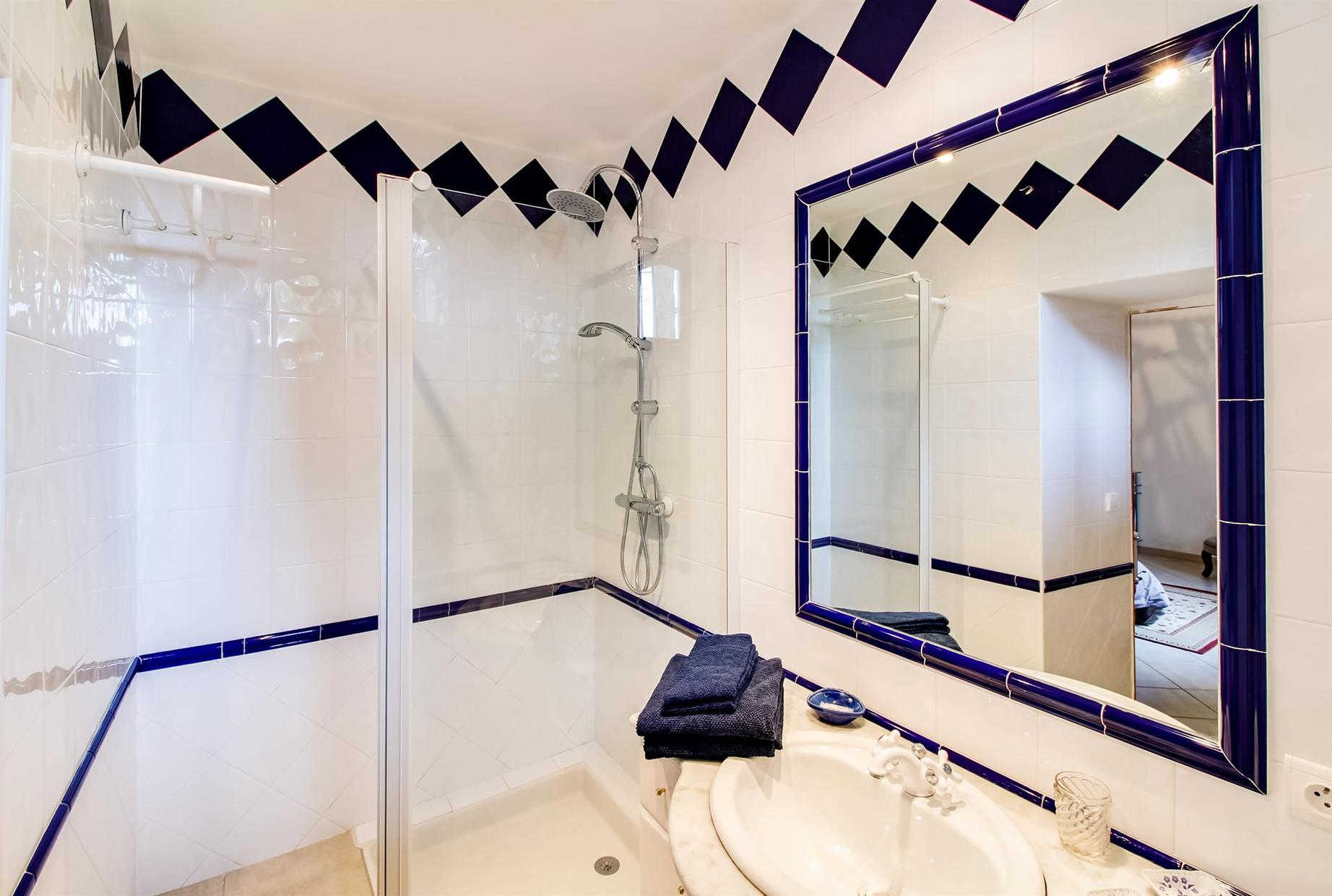 – The Blue room, with views over the garden, private bathroom including WC and adjoining dressing room. The small adjoining room can be used as a baby’s room.