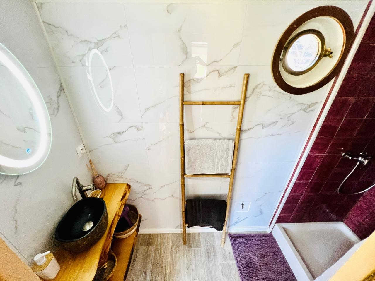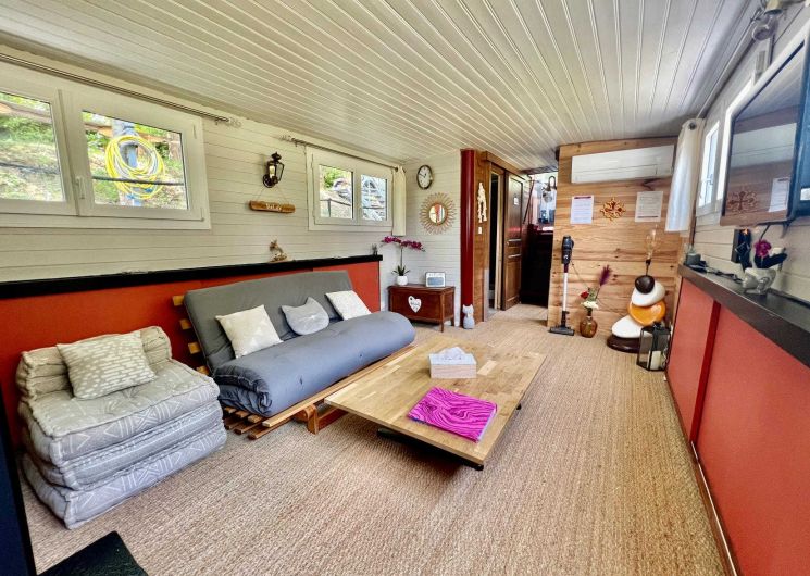 This cosy barge can accommodate up to 7 people. You enter the captain’s cabin, which has been converted into a fully-equipped galley, and a few steps lead down to the saloon with a lift-up coffee table for dining inside, a 140×200 futon sofa-bed and a modular footstool armchair that can be converted into an extra bed for 1 person.