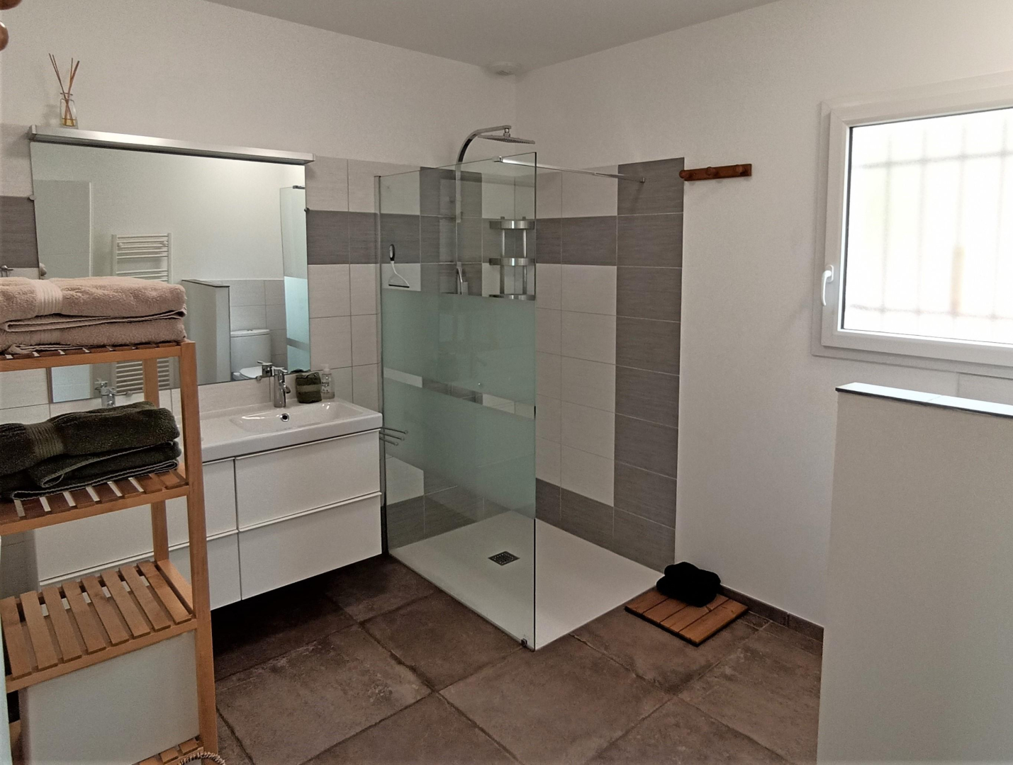 * salle d’eau avec douche italienne, lavabo double vasque, WC, sèche serviettes électrique, sèche cheveux