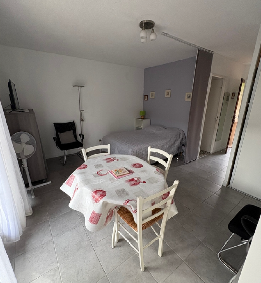 T1 bis situé à 250m des Thermes au rez de chaussée avec balcon, exposition sud au rez de chaussée, équipé et meublé. Salle de bain avec douche à l’italienne et meuble. La partie nuit est séparée du séjour par un rideau.