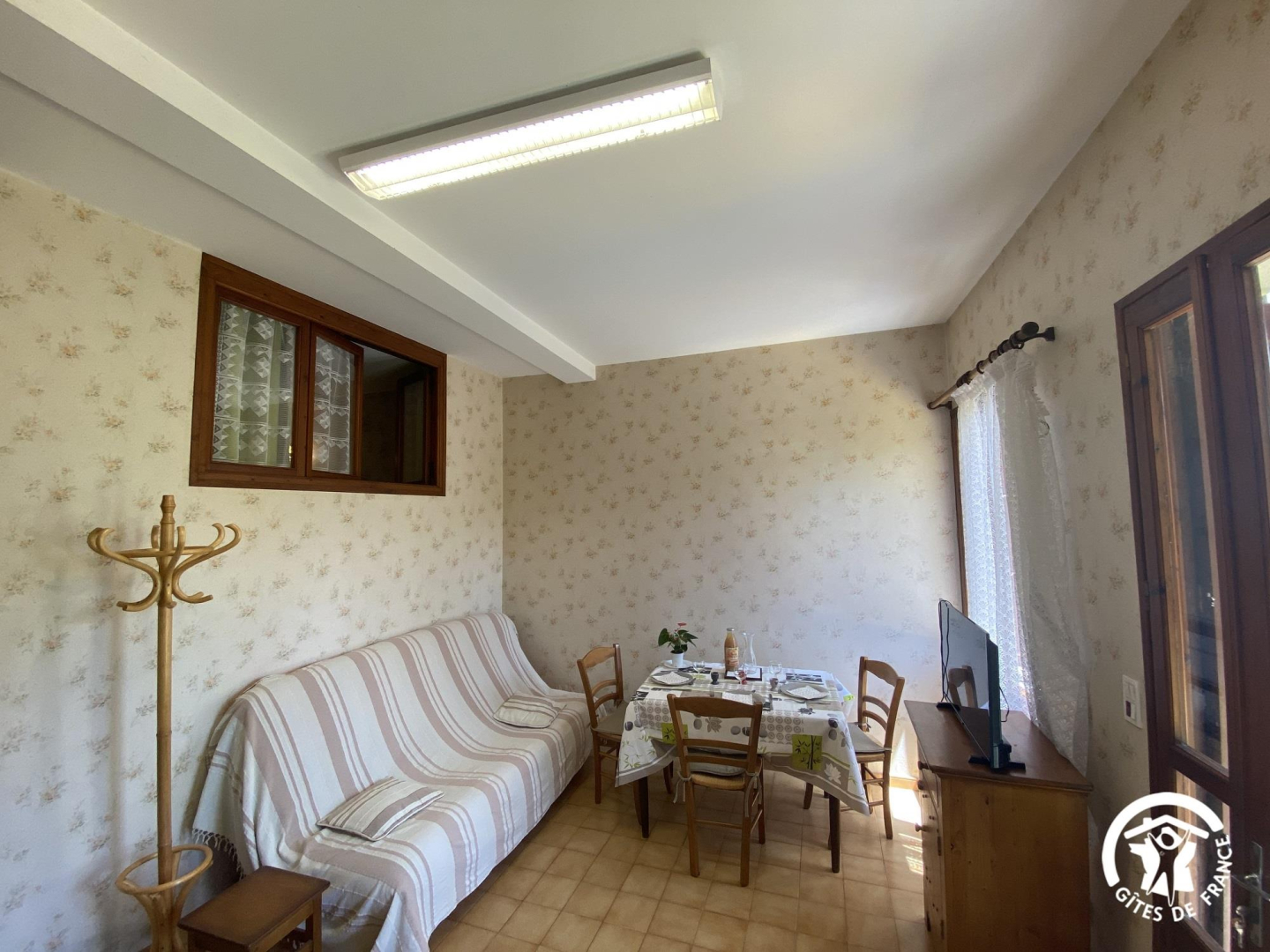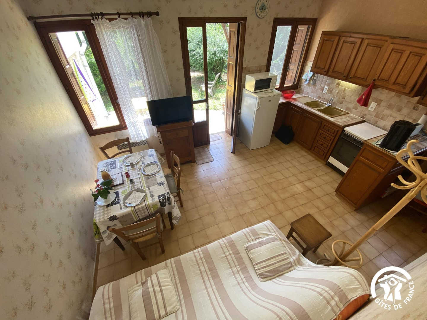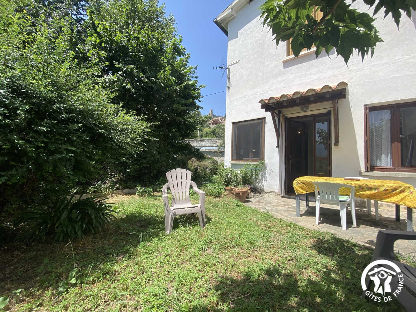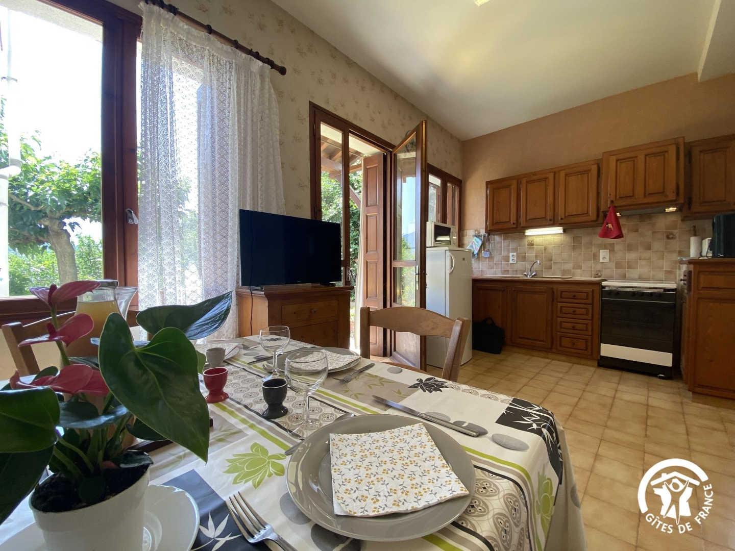This semi-detached gîte with its rustic charm welcomes you to an exceptional natural setting, between the Mediterranean and the Canigou massif. Nestling in the Conflent region at the foot of the Pyrenees, it offers uninterrupted views of the surrounding mountains and the picturesque village. Nearby, don’t miss a visit to the abbey of Saint-Michel-de-Cuxa, the baths of Vernet-les-Bains or the colourful markets of Prades. The gîte comprises a ground-floor flat. You’ll find a living room with an open-plan kitchen area (sofa). A relaxation area with a single bed (90×190), a bathroom with shower, separate WC and an alcove bedroom with a double bed (140×190) complete this level. Outside, you’ll enjoy a shared garden planted with flowers and trees, with views of the Canigou and the village of Eus. There’s also a shaded terrace where you can enjoy your meals al fresco or simply relax in a peaceful, natural setting.
