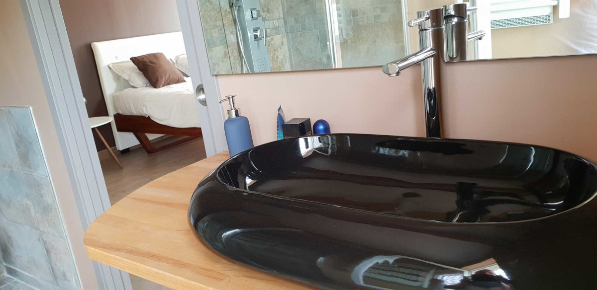 Pour votre confort, nos chambres, à la décoration moderne et soignée sont climatisées et avec salle d’eau privative. Vous bénéficiez également d’un parking privé sécurisé. Nos chambres d’hôtes sont réservées aux adultes. Pour vous détendre, une grande piscine chauffée, un jacuzzi et une terrasse de plus de 100 m2 sont en accès libre. Sur plus de 600m2 vous découvrirez notre salon d’été sous les Pins, ainsi que différents endroits pour vous relaxer. Un salon commun est également à votre disposition, toute la journée et gratuitement, vous pouvez déguster un café, thé et quelques gourmandises. Une dégustation vous est proposée durant l’été (tapas, huitres…) dans notre espace paillotte. Fabrice, cuisinier de formation, a le plaisir de vous proposer une Table d’Hôtes (sur réservation) avec des plats régionaux élaborés à base de produits frais de nos producteurs locaux. Nous sommes à moins de 5 minutes d’activités nautiques : canoë et croisière sur l’Hérault, à moins de 10 minutes du canal du midi et ses croisières. – Chambre avec lit king-size, armoire, table pour 2 personnes, climatisation, salle de bain de 5.5m²